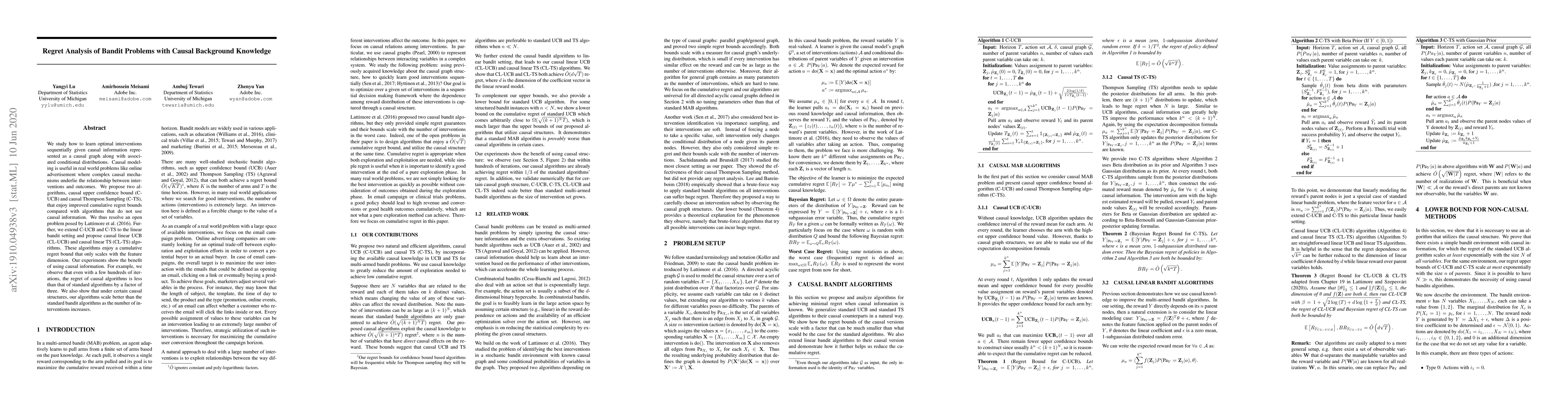 We study how to learn optimal interventions sequentially given causal information represented as a causal graph along with associated conditional distributions. Causal modeling is useful in real world problems like online advertisement where complex causal mechanisms underlie the relationship between interventions and outcomes. We propose two algorithms, causal upper confidence bound (C-UCB) and causal Thompson Sampling (C-TS), that enjoy improved cumulative regret bounds compared with algorithms that do not use causal information. We thus resolve an open problem posed by \cite{lattimore2016causal}. Further, we extend C-UCB and C-TS to the linear bandit setting and propose causal linear UCB (CL-UCB) and causal linear TS (CL-TS) algorithms. These algorithms enjoy a cumulative regret bound that only scales with the feature dimension. Our experiments show the benefit of using causal information. For example, we observe that even with a few hundreds of iterations, the regret of causal algorithms is less than that of standard algorithms by a factor of three. We also show that under certain causal structures, our algorithms scale better than the standard bandit algorithms as the number of interventions increases.