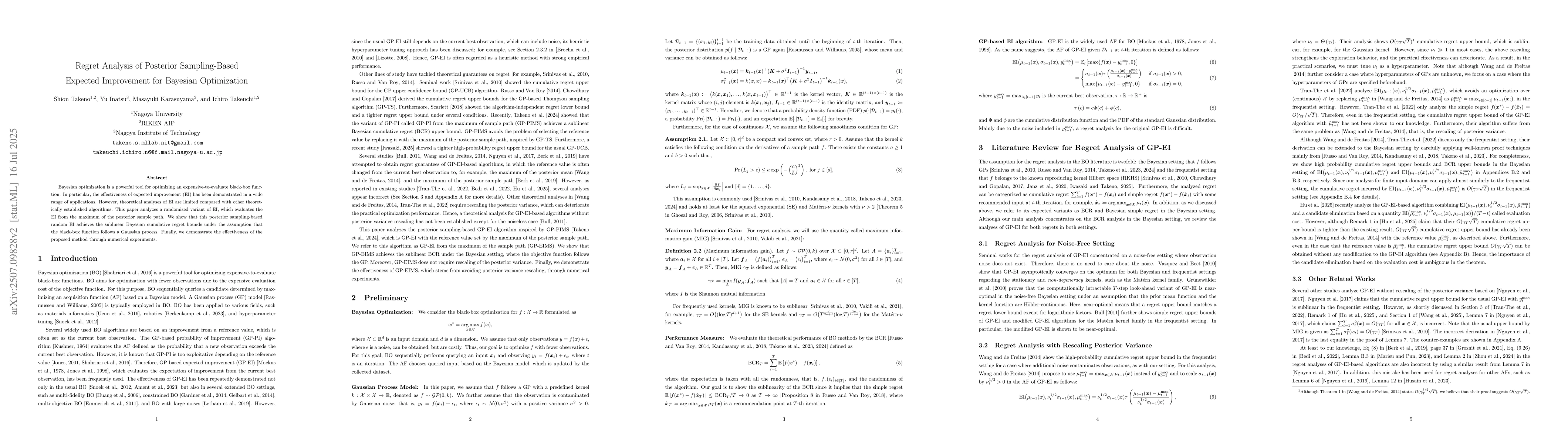 Bayesian optimization is a powerful tool for optimizing an expensive-to-evaluate black-box function. In particular, the effectiveness of expected improvement (EI) has been demonstrated in a wide range of applications. However, theoretical analyses of EI are limited compared with other theoretically established algorithms. This paper analyzes a randomized variant of EI, which evaluates the EI from the maximum of the posterior sample path. We show that this posterior sampling-based random EI achieves the sublinear Bayesian cumulative regret bounds under the assumption that the black-box function follows a Gaussian process. Finally, we demonstrate the effectiveness of the proposed method through numerical experiments.