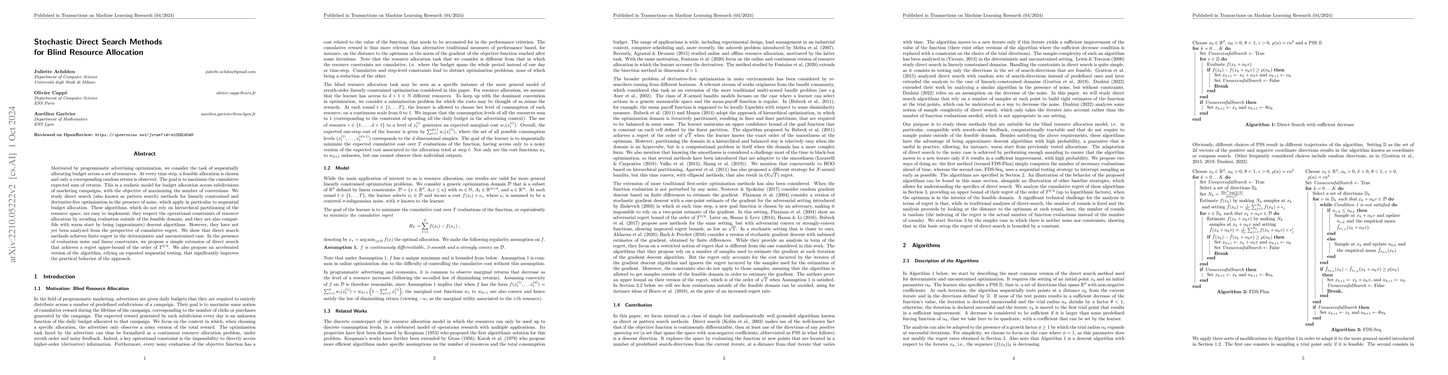 This paper analyzes the stochastic direct search method for optimizing budget allocation in marketing campaigns, providing a regret upper-bound of T 2/3. It also introduces an enhanced version of the method using sequential tests to identify descent directions more efficiently.