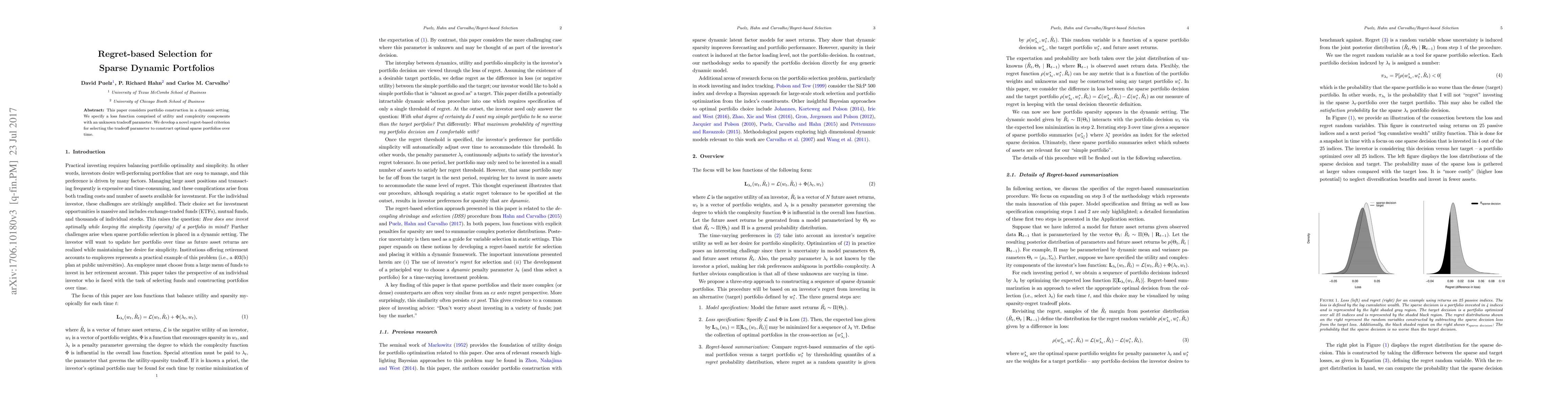 This paper considers portfolio construction in a dynamic setting. We specify a loss function comprised of utility and complexity components with an unknown tradeoff parameter. We develop a novel regret-based criterion for selecting the tradeoff parameter to construct optimal sparse portfolios over time.