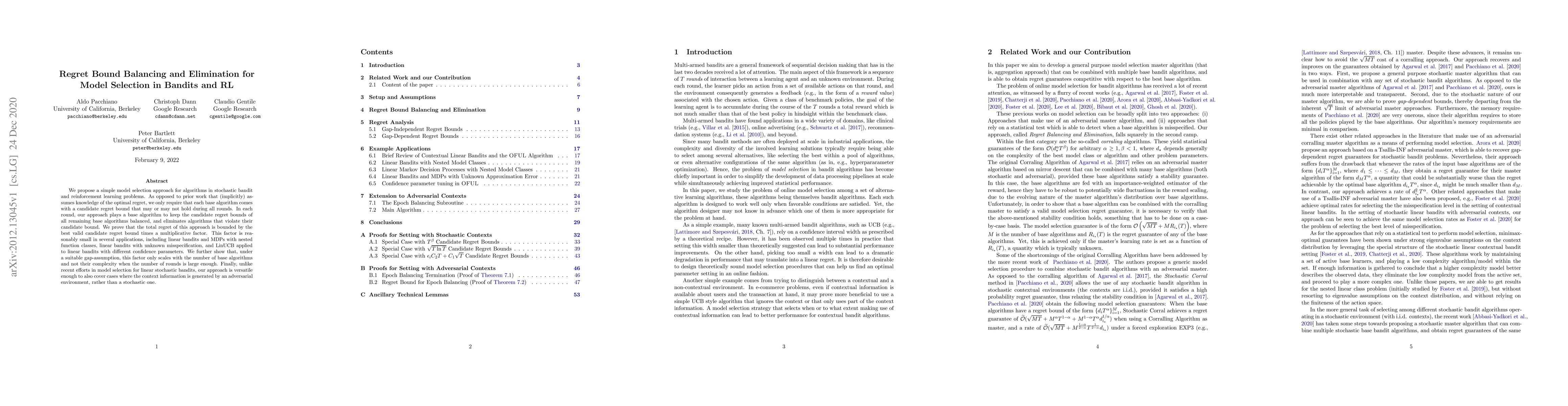 The paper proposes a model selection approach for algorithms in stochastic bandit and reinforcement learning problems, balancing and eliminating base algorithms based on candidate regret bounds without assuming knowledge of the optimal regret.