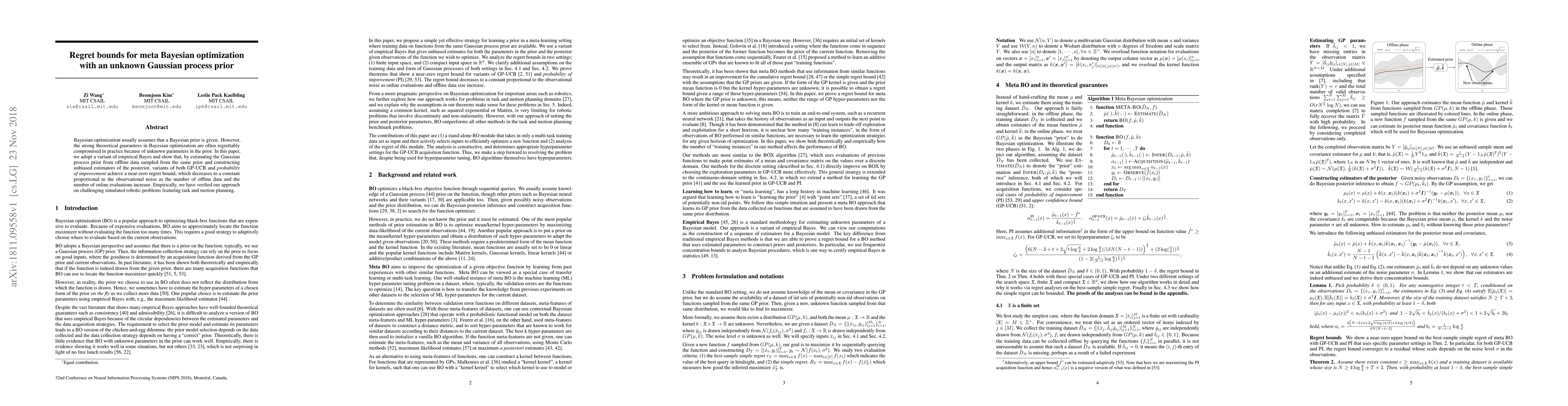 This paper proposes a meta Bayesian optimization method that estimates an unknown Gaussian process prior from offline data. It demonstrates that by constructing unbiased estimators of the posterior, variants of GP-UCB and probability of improvement achieve near-zero regret bounds, which diminish with more offline data and online evaluations.