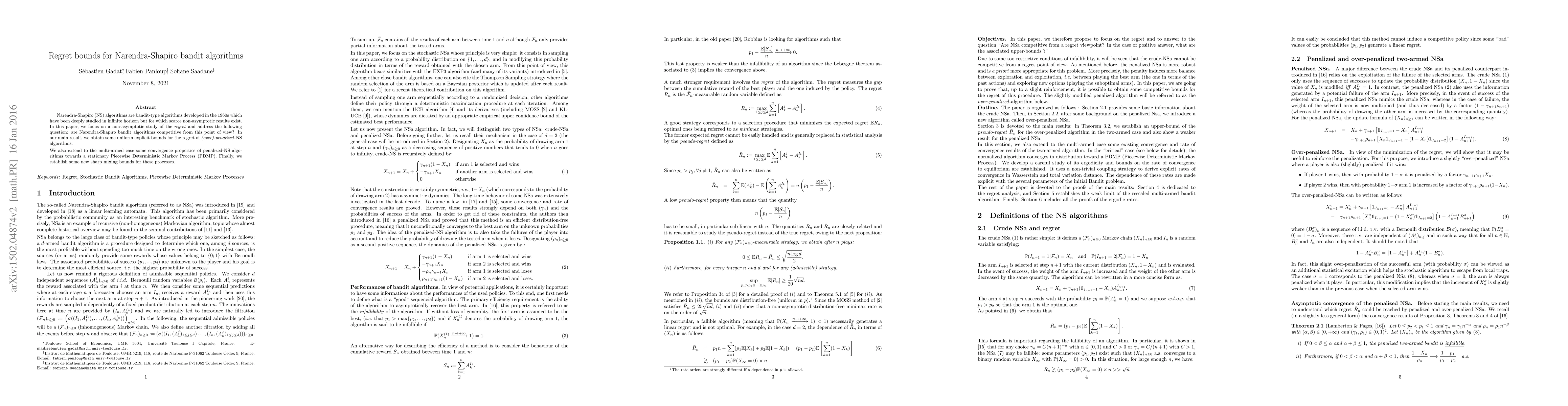 This paper investigates the regret bounds for Narendra-Shapiro (NS) bandit algorithms, demonstrating that penalized versions achieve a pseudo-regret uniformly bounded by $C \sqrt{n}$. It also extends convergence and rate results to the multi-armed case, showing convergence toward the invariant measure of a Piecewise Deterministic Markov Process (PDMP).