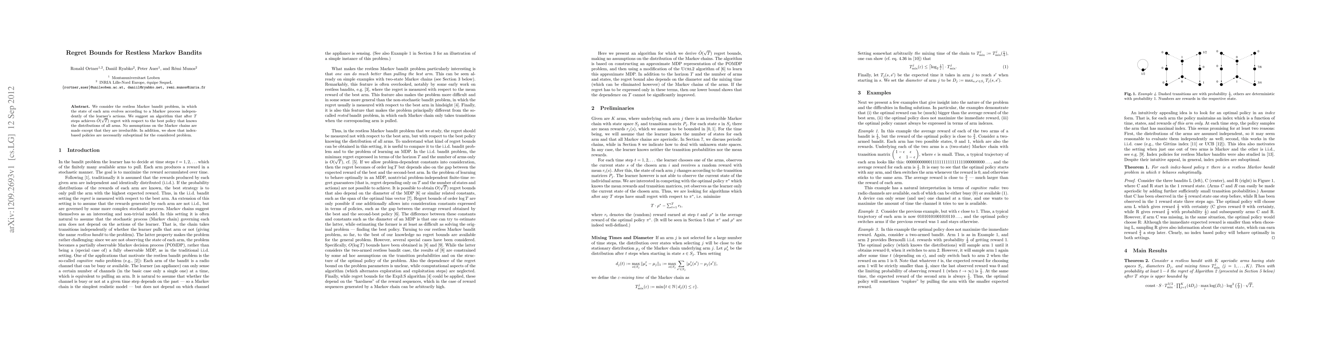 We consider the restless Markov bandit problem, in which the state of each arm evolves according to a Markov process independently of the learner's actions. We suggest an algorithm that after $T$ steps achieves $\tilde{O}(\sqrt{T})$ regret with respect to the best policy that knows the distributions of all arms. No assumptions on the Markov chains are made except that they are irreducible. In addition, we show that index-based policies are necessarily suboptimal for the considered problem.