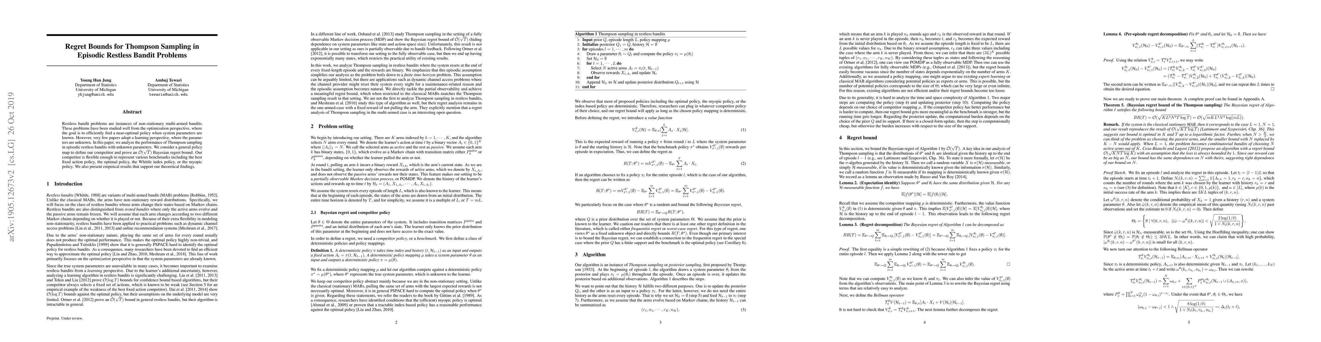 This paper investigates Thompson sampling for solving episodic restless bandit problems with unknown parameters, achieving a $\tilde{\mathcal{O}}(\sqrt{T})$ Bayesian regret bound. It compares against flexible competitor policies and provides empirical validation of the theoretical results.