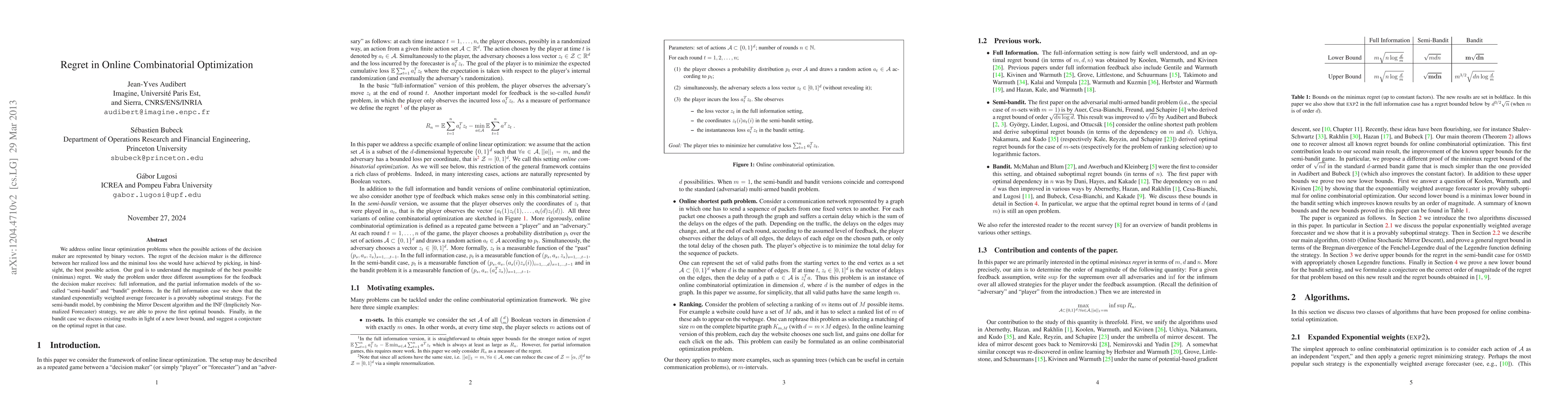 We address online linear optimization problems when the possible actions of the decision maker are represented by binary vectors. The regret of the decision maker is the difference between her realized loss and the best loss she would have achieved by picking, in hindsight, the best possible action. Our goal is to understand the magnitude of the best possible (minimax) regret. We study the problem under three different assumptions for the feedback the decision maker receives: full information, and the partial information models of the so-called "semi-bandit" and "bandit" problems. Combining the Mirror Descent algorithm and the INF (Implicitely Normalized Forecaster) strategy, we are able to prove optimal bounds for the semi-bandit case. We also recover the optimal bounds for the full information setting. In the bandit case we discuss existing results in light of a new lower bound, and suggest a conjecture on the optimal regret in that case. Finally we also prove that the standard exponentially weighted average forecaster is provably suboptimal in the setting of online combinatorial optimization.