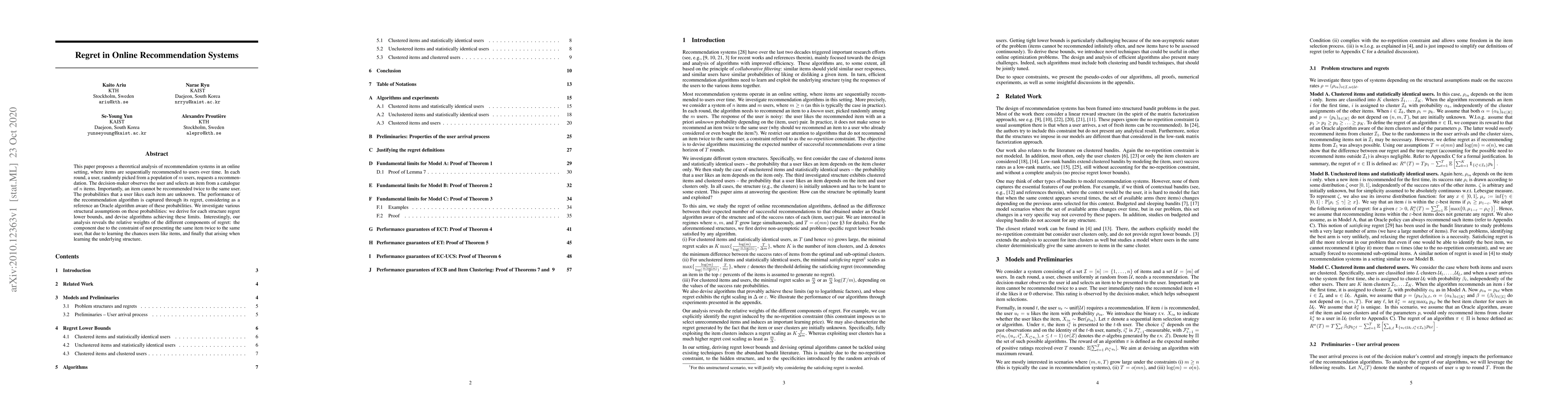 This paper analyzes online recommendation systems to understand regret, a measure of performance compared to an ideal algorithm aware of user preferences. It reveals the relative importance of constraints on recommendations and learning users' tastes.