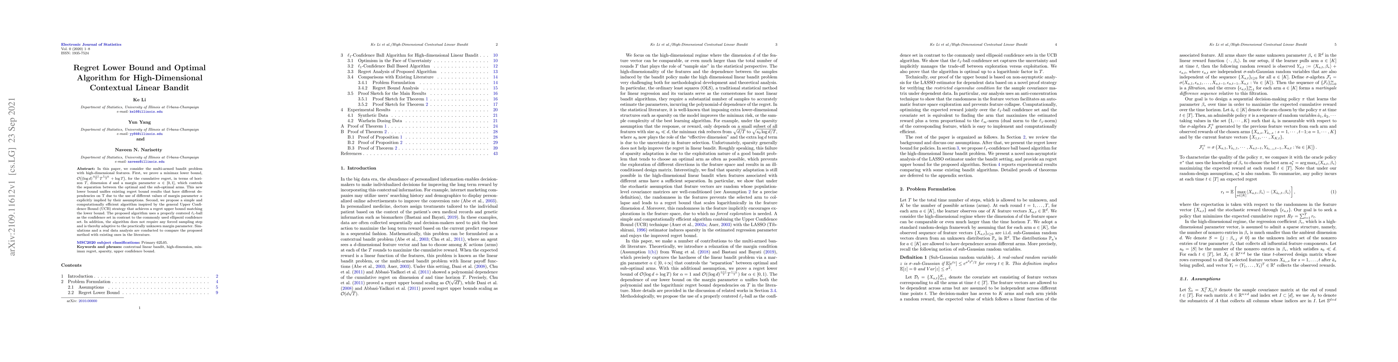 In this paper, we consider the multi-armed bandit problem with high-dimensional features. First, we prove a minimax lower bound, $\mathcal{O}\big((\log d)^{\frac{\alpha+1}{2}}T^{\frac{1-\alpha}{2}}+\log T\big)$, for the cumulative regret, in terms of horizon $T$, dimension $d$ and a margin parameter $\alpha\in[0,1]$, which controls the separation between the optimal and the sub-optimal arms. This new lower bound unifies existing regret bound results that have different dependencies on T due to the use of different values of margin parameter $\alpha$ explicitly implied by their assumptions. Second, we propose a simple and computationally efficient algorithm inspired by the general Upper Confidence Bound (UCB) strategy that achieves a regret upper bound matching the lower bound. The proposed algorithm uses a properly centered $\ell_1$-ball as the confidence set in contrast to the commonly used ellipsoid confidence set. In addition, the algorithm does not require any forced sampling step and is thereby adaptive to the practically unknown margin parameter. Simulations and a real data analysis are conducted to compare the proposed method with existing ones in the literature.
