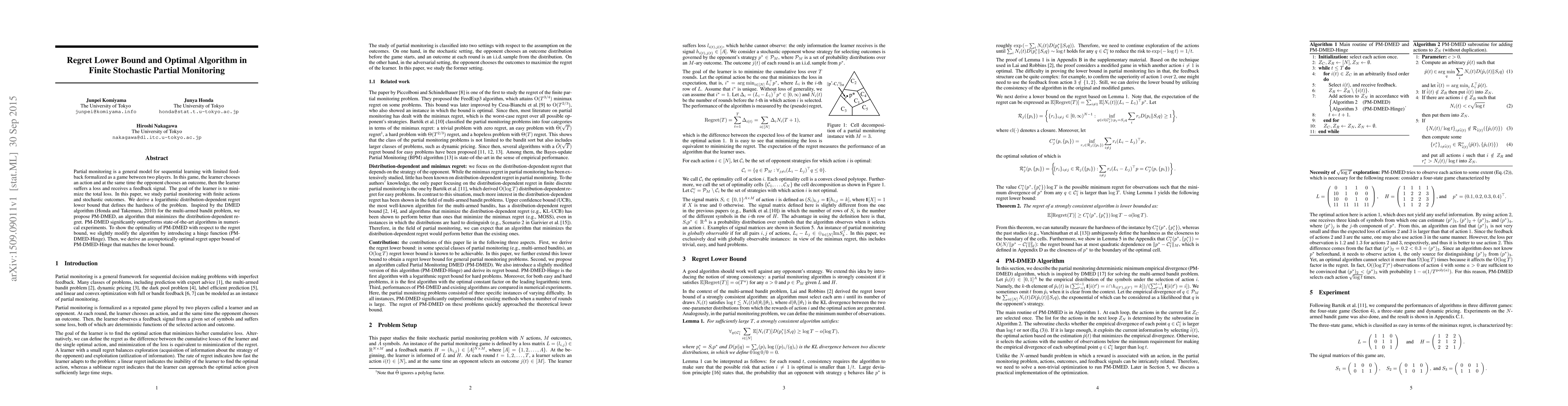 This paper establishes a logarithmic lower bound for distribution-dependent regret in finite stochastic partial monitoring and proposes PM-DMED, an algorithm that achieves this bound. PM-DMED-Hinge, an optimized variant, matches the derived regret upper bound, proving its optimality.