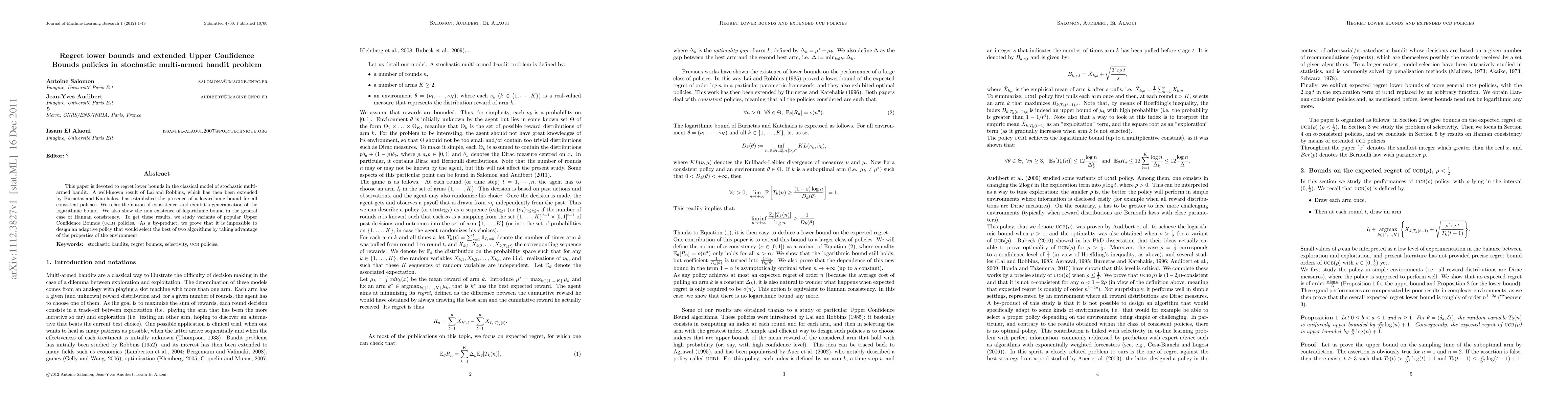 This paper investigates lower bounds on regret in the stochastic multi-armed bandit problem, generalizing the logarithmic bound for consistent policies and proving the nonexistence of such bounds under Hannan consistency. It also examines extended Upper Confidence Bounds policies and concludes that no adaptive policy can select the best of two algorithms based on environmental properties.