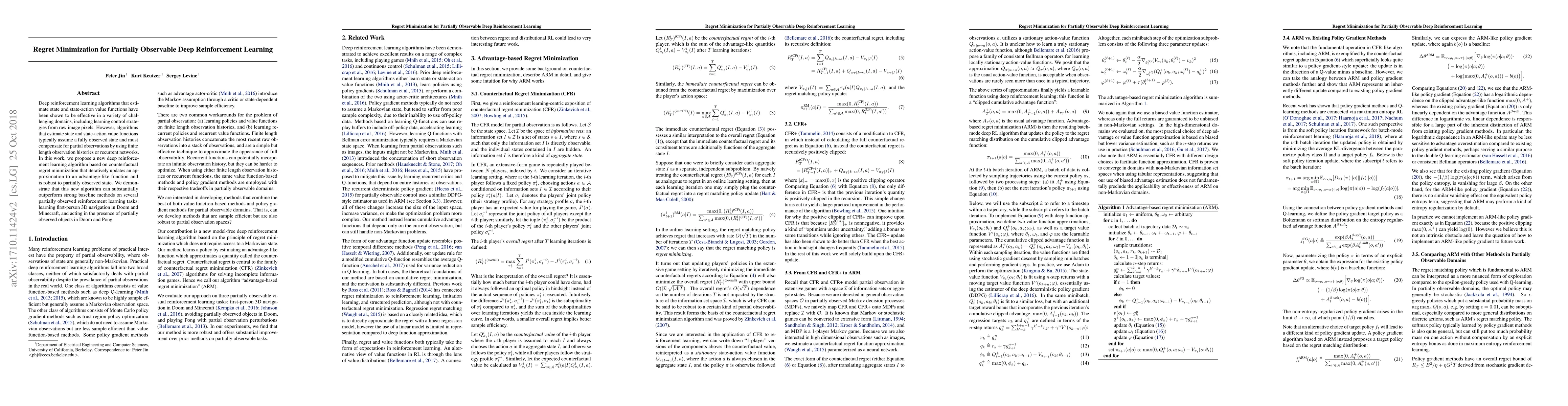 This paper proposes a new deep reinforcement learning algorithm based on counterfactual regret minimization to handle partial observations, iteratively updating an advantage-like function. The algorithm outperforms baseline methods in tasks with partial observations, such as first-person navigation in Doom and Minecraft, and partially observed object interactions in Doom and Pong.