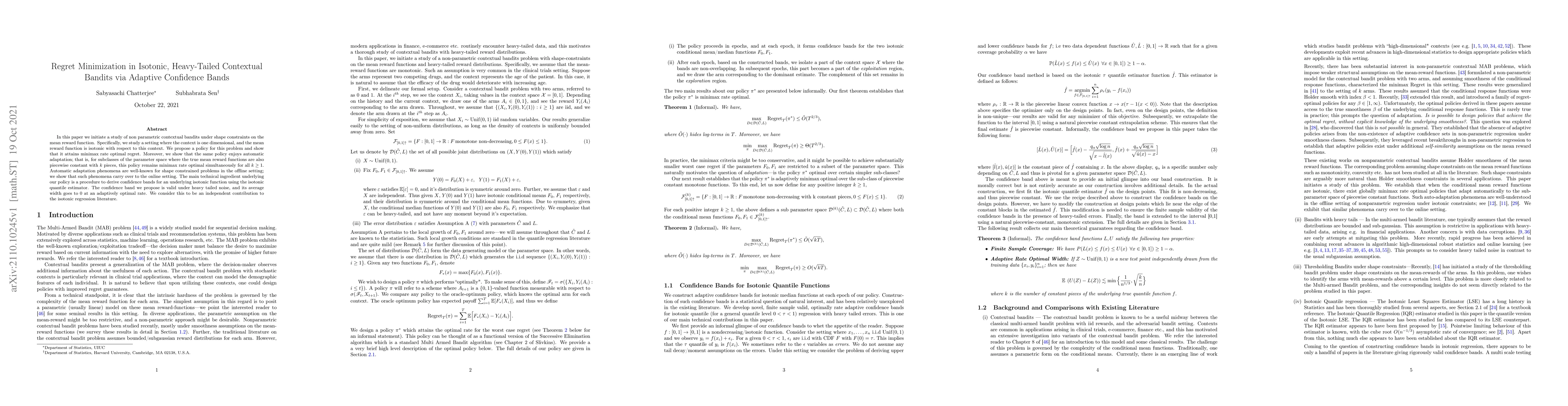 This paper proposes a policy for isotonic, heavy-tailed contextual bandits that achieves minimax rate optimal regret and automatically adapts to piecewise constant reward functions. The key technical contribution is an adaptive confidence band procedure for isotonic regression that works under heavy-tailed noise.