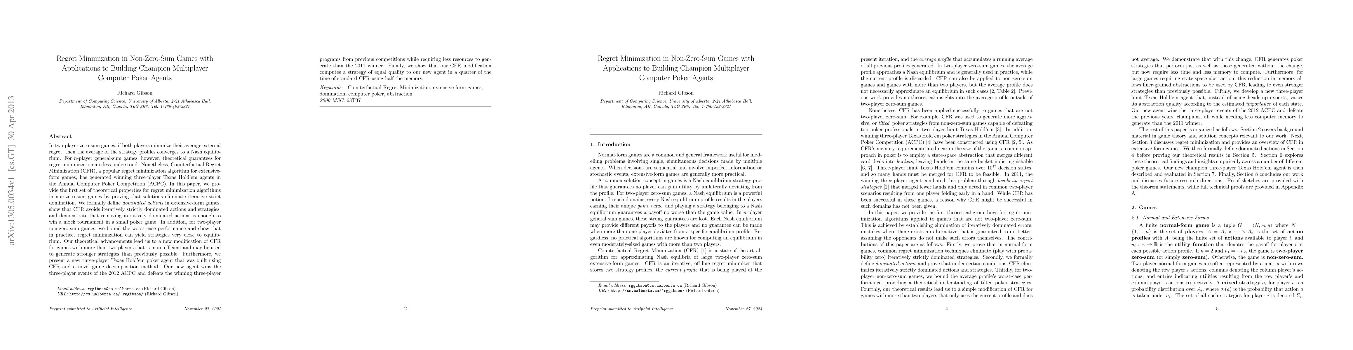 This paper presents theoretical properties for regret minimization in non-zero-sum games, proving that regret minimization algorithms eliminate iteratively strict domination. It introduces a modified version of CFR for multi-player games, creating a new three-player Texas Hold'em agent that wins competitions, requiring fewer resources than previous winners.