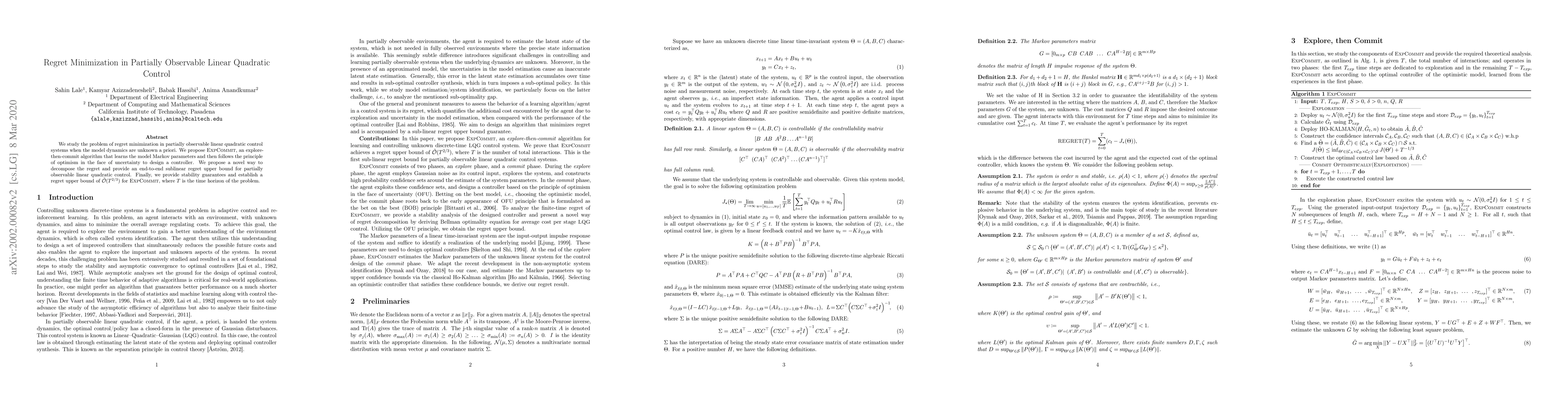 This paper proposes ExpCommit, an explore-then-commit algorithm for regret minimization in partially observable linear quadratic control systems with unknown dynamics. It provides a sublinear regret upper bound of $\tilde{\mathcal{O}}(T^{2/3})$ and stability guarantees for the controller.