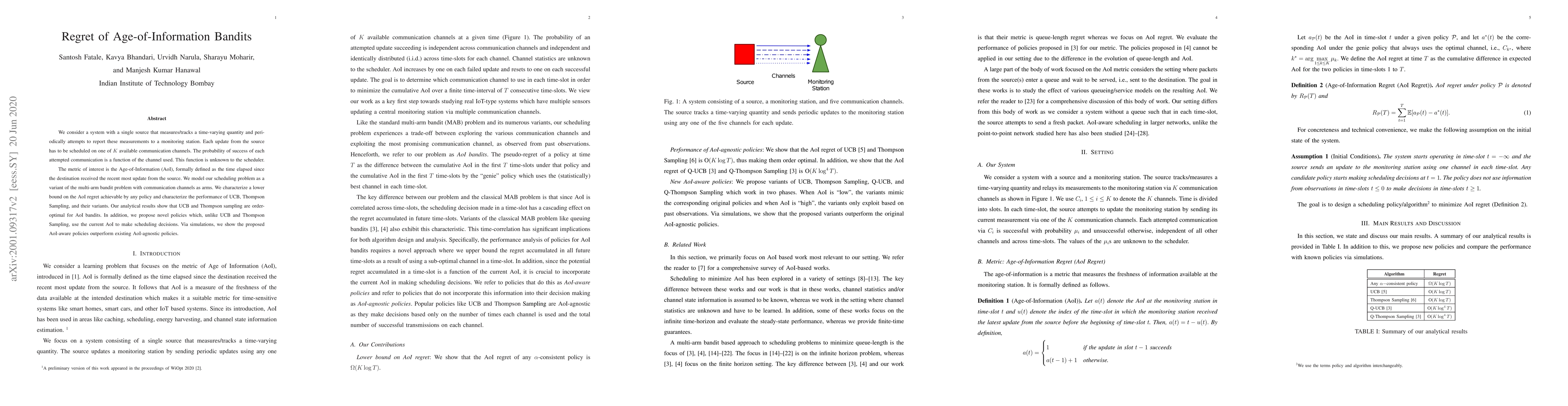 We consider a system with a single source that measures/tracks a time-varying quantity and periodically attempts to report these measurements to a monitoring station. Each update from the source has to be scheduled on one of K available communication channels. The probability of success of each attempted communication is a function of the channel used. This function is unknown to the scheduler. The metric of interest is the Age-of-Information (AoI), formally defined as the time elapsed since the destination received the recent most update from the source. We model our scheduling problem as a variant of the multi-arm bandit problem with communication channels as arms. We characterize a lower bound on the AoI regret achievable by any policy and characterize the performance of UCB, Thompson Sampling, and their variants. Our analytical results show that UCB and Thompson sampling are order-optimal for AoI bandits. In addition, we propose novel policies which, unlike UCB and Thompson Sampling, use the current AoI to make scheduling decisions. Via simulations, we show the proposed AoI-aware policies outperform existing AoI-agnostic policies.