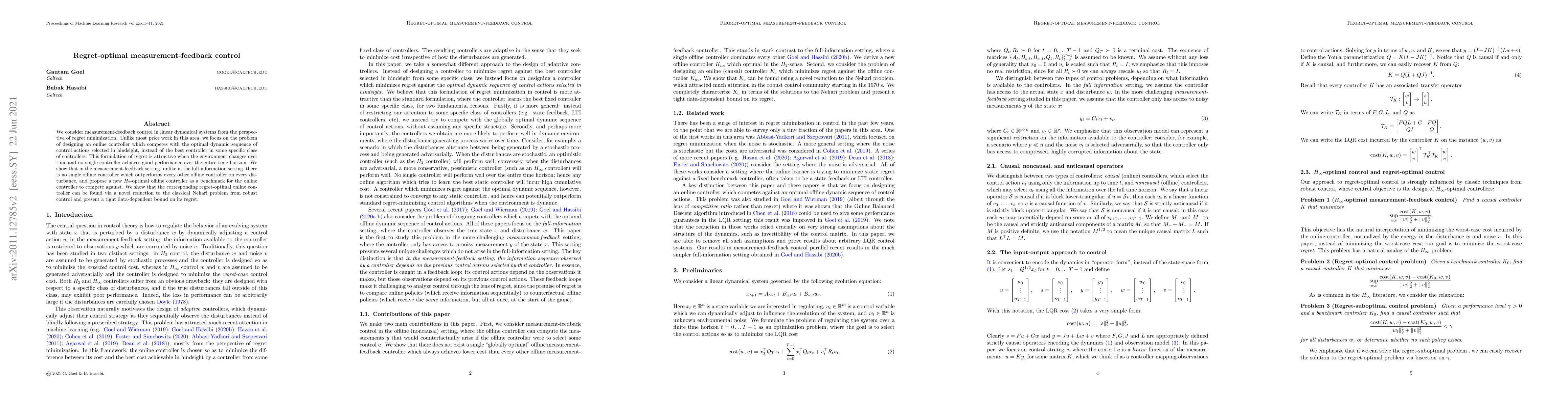 We consider measurement-feedback control in linear dynamical systems from the perspective of regret minimization. Unlike most prior work in this area, we focus on the problem of designing an online controller which competes with the optimal dynamic sequence of control actions selected in hindsight, instead of the best controller in some specific class of controllers. This formulation of regret is attractive when the environment changes over time and no single controller achieves good performance over the entire time horizon. We show that in the measurement-feedback setting, unlike in the full-information setting, there is no single offline controller which outperforms every other offline controller on every disturbance, and propose a new $H_2$-optimal offline controller as a benchmark for the online controller to compete against. We show that the corresponding regret-optimal online controller can be found via a novel reduction to the classical Nehari problem from robust control and present a tight data-dependent bound on its regret.