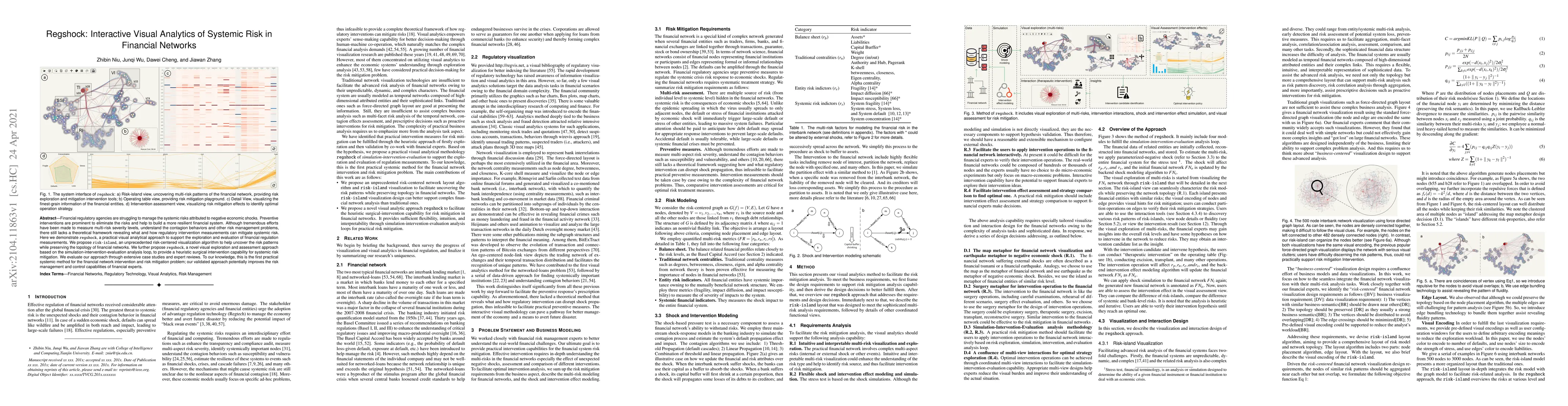Regshock offers a visual analytical framework to explore and evaluate financial regulatory interventions for systemic risk mitigation, using a novel risk-island visualization and a simulation-intervention-evaluation loop. It represents a first practical systemic method for addressing financial network risk, enhancing experts' risk management capabilities.