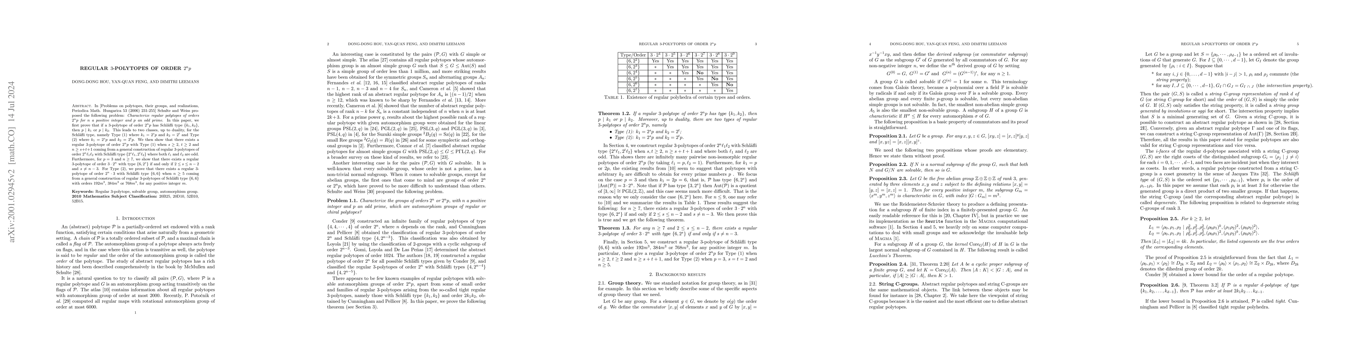 In [Problems on polytopes, their groups, and realizations, Periodica Math. Hungarica 53 (2006) 231-255] Schulte and Weiss proposed the following problem: {\em Characterize regular polytopes of orders $2^np$ for $n$ a positive integer and $p$ an odd prime}. In this paper, we first prove that if a $3$-polytope of order $2^np$ has Schl\"afli type $\{k_1, k_2\}$, then $p \mid k_1$ or $p \mid k_2$. This leads to two classes, up to duality, for the Schl\"afli type, namely Type (1) where $k_1=2^sp$ and $k_2=2^t$ and Type (2) where $k_1=2^sp$ and $k_2=2^tp$. We then show that there exists a regular $3$-polytope of order $2^np$ with Type (1) when $s\geq 2$, $t\geq 2$ and $n\geq s+t+1$ coming from a general construction of regular $3$-polytopes of order $2^n\ell_1\ell_2$ with Schl\"afli type $\{2^s\ell_1,2^t\ell_2\}$ when $s, t \geq 2$, $n\geq s+t+1$, and both $\ell_1$ and $\ell_2$ are odd. For Type (2), we prove that there exists a regular $3$-polytope of order $2^n\cdot 3$ with Schl\"afli type $\{6, 6\}$ when $n \ge 5$ coming from a general construction of regular $3$-polytopes of Schl\"afli type $\{6,6\}$ with orders $192m^3$, $384m^3$ or $768m^3$, for any positive integer $m$.