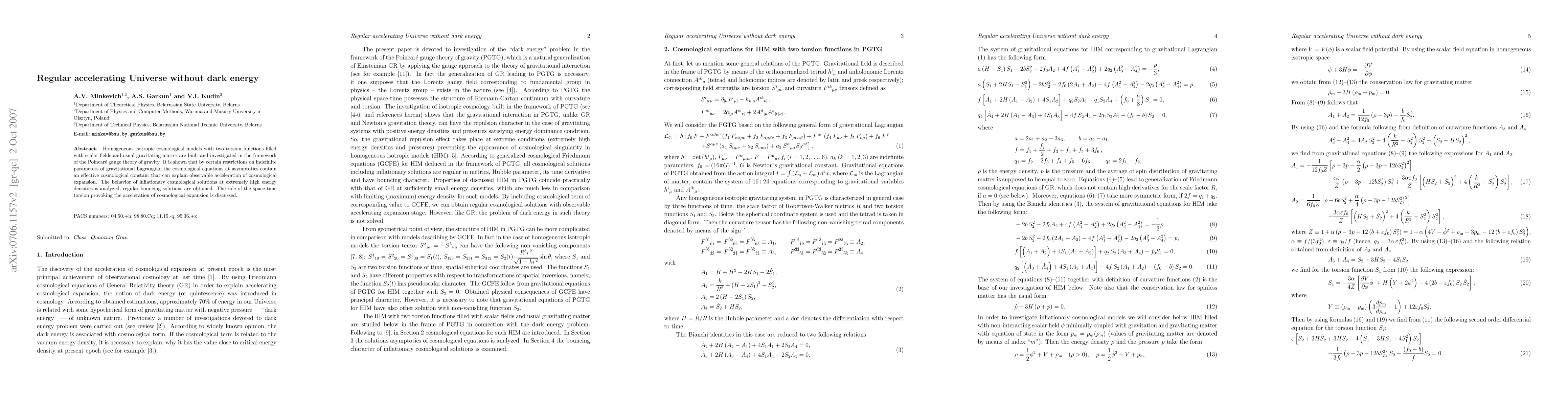 Homogeneous isotropic cosmological models with two torsion functions filled with scalar fields and usual gravitating matter are built and investigated in the framework of the Poincar\'e gauge theory of gravity. It is shown that by certain restrictions on indefinite parameters of gravitational Lagrangian the cosmological equations at asymptotics contain an effective cosmological constant that can explain observable acceleration of cosmological expansion. The behavior of inflationary cosmological solutions at extremely high energy densities is analyzed, regular bouncing solutions are obtained. The role of the space-time torsion provoking the acceleration of cosmological expansion is discussed.