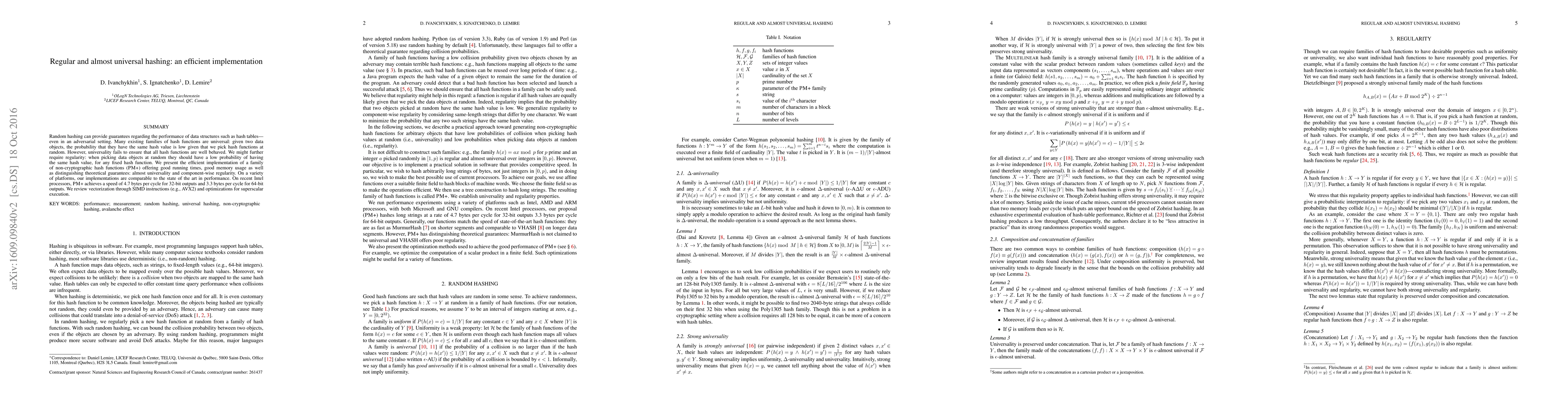 Random hashing can provide guarantees regarding the performance of data structures such as hash tables---even in an adversarial setting. Many existing families of hash functions are universal: given two data objects, the probability that they have the same hash value is low given that we pick hash functions at random. However, universality fails to ensure that all hash functions are well behaved. We further require regularity: when picking data objects at random they should have a low probability of having the same hash value, for any fixed hash function. We present the efficient implementation of a family of non-cryptographic hash functions (PM+) offering good running times, good memory usage as well as distinguishing theoretical guarantees: almost universality and component-wise regularity. On a variety of platforms, our implementations are comparable to the state of the art in performance. On recent Intel processors, PM+ achieves a speed of 4.7 bytes per cycle for 32-bit outputs and 3.3 bytes per cycle for 64-bit outputs. We review vectorization through SIMD instructions (e.g., AVX2) and optimizations for superscalar execution.