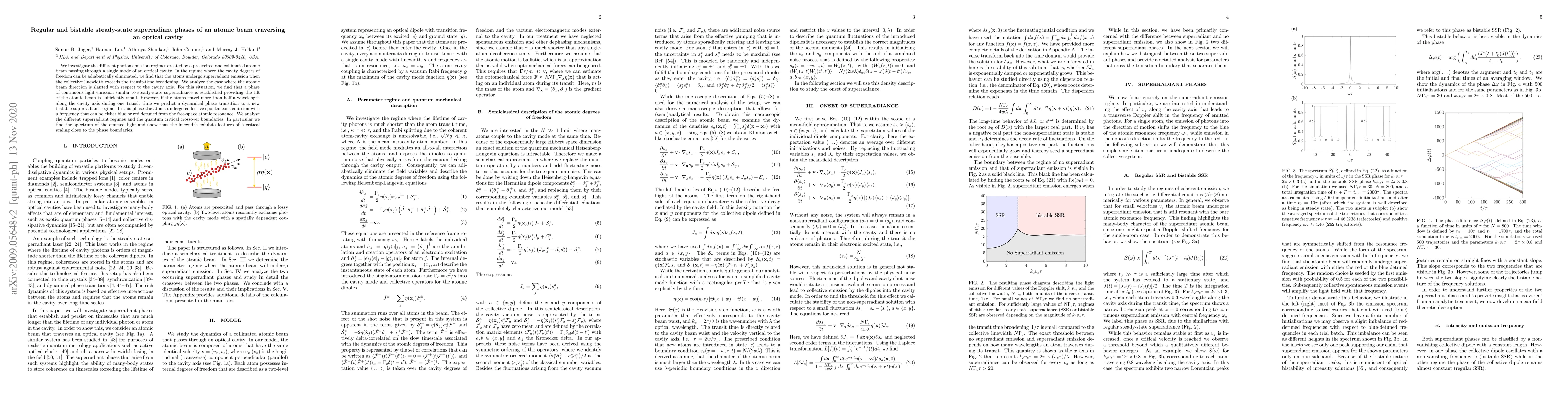 This paper explores the photon emission regimes from a preexcited atomic beam passing through an optical cavity, identifying regular and bistable steady-state superradiant phases. It predicts a transition to a bistable regime where atoms undergo collective spontaneous emission, with emitted light frequency detuned from the atomic resonance, and analyzes the critical scaling of the linewidth near phase boundaries.