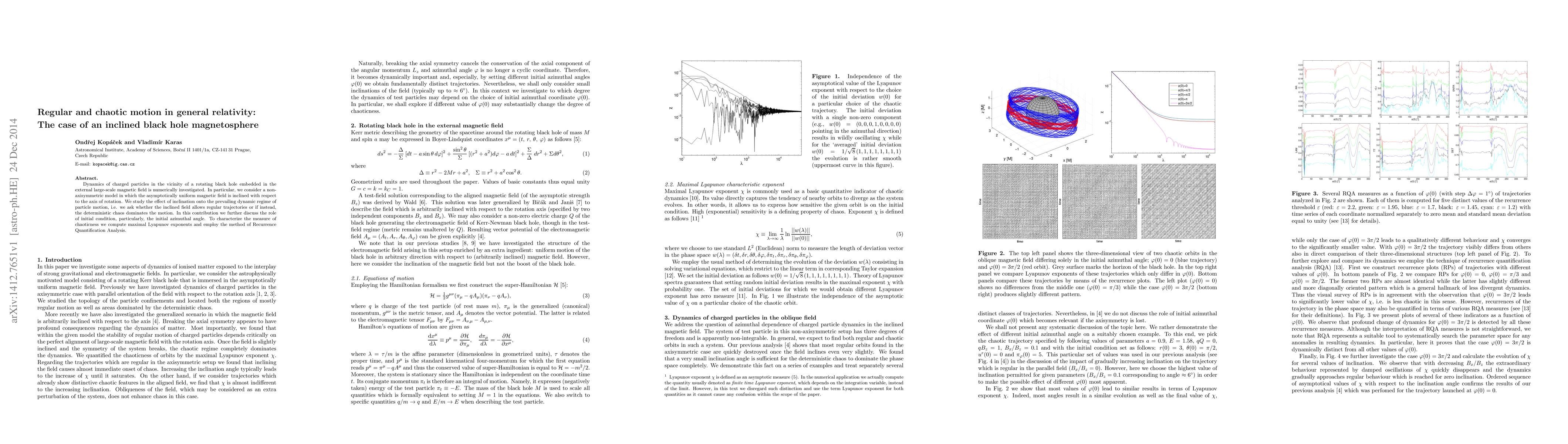 Dynamics of charged particles in the vicinity of a rotating black hole embedded in the external large-scale magnetic field is numerically investigated. In particular, we consider a non-axisymmetric model in which the asymptotically uniform magnetic field is inclined with respect to the axis of rotation. We study the effect of inclination onto the prevailing dynamic regime of particle motion, i.e. we ask whether the inclined field allows regular trajectories or if instead, the deterministic chaos dominates the motion. In this contribution we further discuss the role of initial condition, particularly, the initial azimuthal angle. To characterize the measure of chaoticness we compute maximal Lyapunov exponents and employ the method of Recurrence Quantification Analysis.