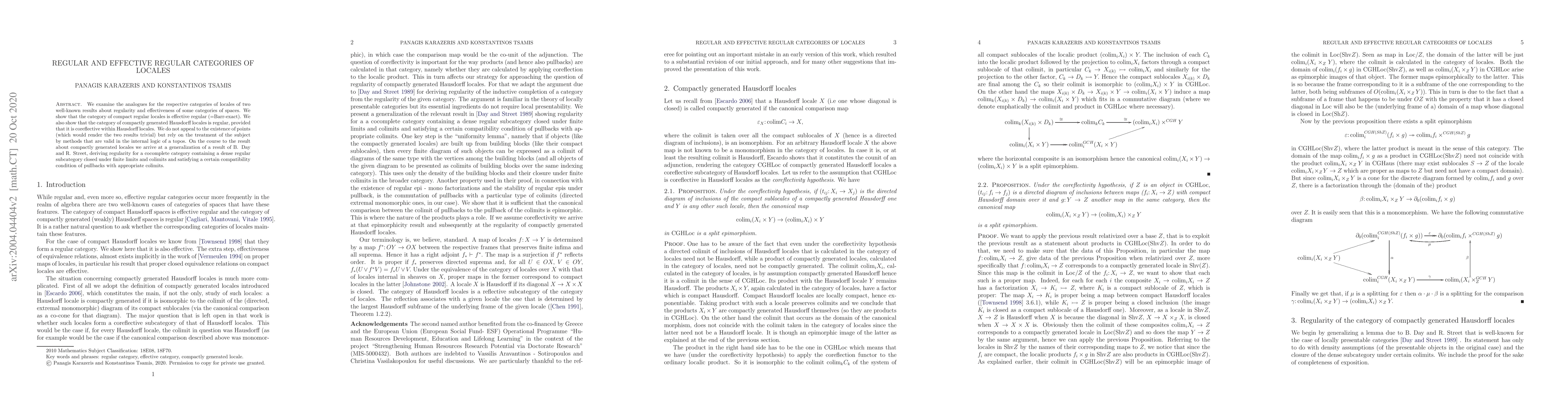 We examine the analogues for the respective categories of locales of two well-known results about regularity and effectiveness of some categories of spaces. We show that the category of compact regular locales is effective regular (=Barr-exact). We also show that the category of compactly generated Hausdorff locales is regular, provided that it is coreflective within Hausdorff locales. We do not appeal to the existence of points (which would render the two results trivial) but rely on the treatment of the subject by methods that are valid in the internal logic of a topos. On the course to the result about compactly generated locales we arrive at a generalization of a result of B. Day and R. Street, deriving regularity for a cocomplete category containing a dense regular subcategory closed under finite limits and colimits and satisfying a certain compatibility condition of pullbacks with appropriate colimits.