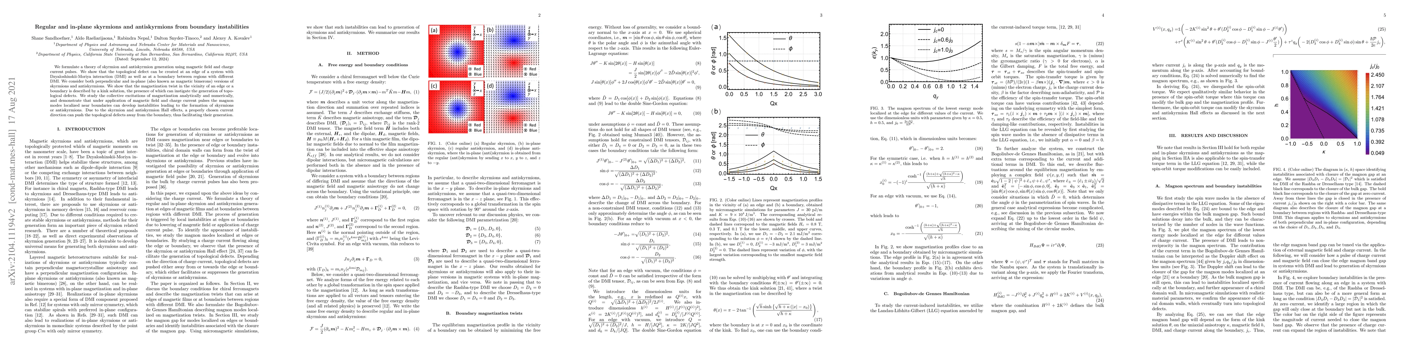 We formulate a theory of skyrmion and antiskyrmion generation using magnetic field and charge current pulses. We show that the topological defect can be created at an edge of a system with Dzyaloshinskii-Moriya interaction (DMI) as well as at a boundary between regions with different DMI. We consider both perpendicular and in-plane (also known as magnetic bimerons) versions of skyrmions and antiskyrmions. We show that the magnetization twist in the vicinity of an edge or a boundary is described by a kink solution, the presence of which can instigate the generation of topological defects. We study the collective excitations of magnetization analytically and numerically, and demonstrate that under application of magnetic field and charge current pulses the magnon modes localized near boundaries can develop instabilities leading to the formation of skyrmions or antiskyrmions. Due to the skyrmion and antiskyrmion Hall effects, a properly chosen current direction can push the topological defects away from the boundary, thus facilitating their generation.