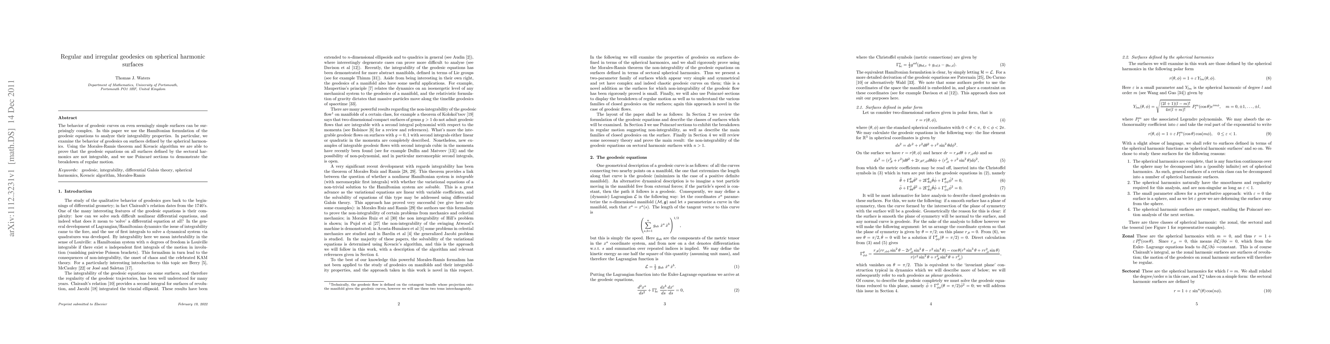 The study finds that geodesic curves on spherical harmonic surfaces exhibit complex behavior and are non-integrable for most cases, with regular motion breaking down as demonstrated through Poincaré sections.