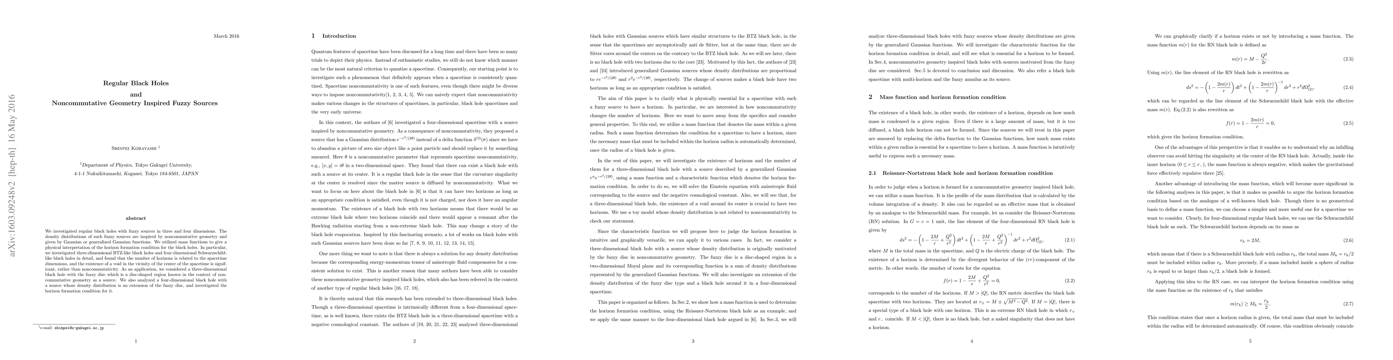 This paper examines regular black holes with fuzzy sources in three and four dimensions, inspired by noncommutative geometry, using density distributions modeled by Gaussian functions. It reveals that horizon formation is linked to spacetime dimensions and the void near the center, rather than noncommutativity, and applies these findings to specific black hole models.