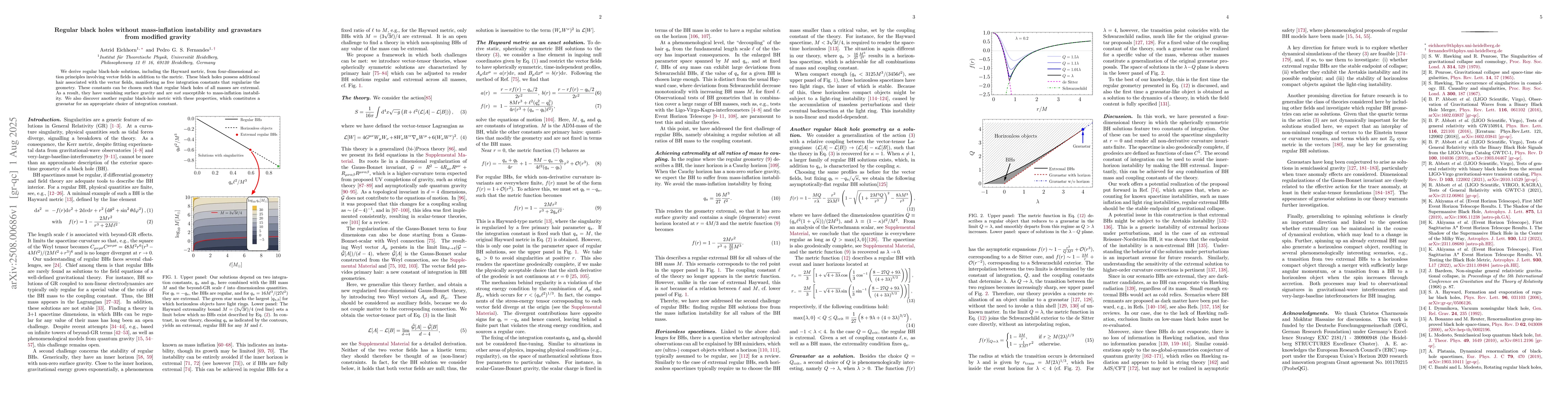 We derive regular black-hole solutions, including the Hayward metric, from four-dimensional action principles involving vector fields in addition to the metric. These black holes possess additional hair associated with the vector fields, manifesting as free integration constants that regularize the geometry. These constants can be chosen such that regular black holes of all masses are extremal. As a result, they have vanishing surface gravity and are not susceptible to mass-inflation instability. We also discover another regular black-hole metric with these properties, which constitutes a gravastar for an appropriate choice of integration constant.