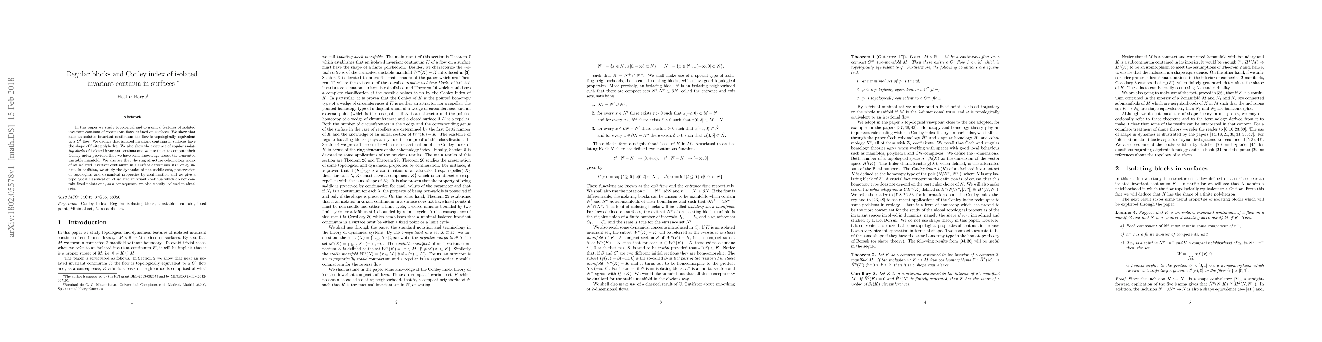 In this paper we study topological and dynamical features of isolated invariant continua of continuous flows defined on surfaces. We show that near an isolated invariant continuum the flow is topologically equivalent to a C1 flow. We deduce that isolated invariant continua in surfaces have the shape of finite polyhedra. We also show the existence of regular isolating blocks of isolated invariant continua and we use them to compute their Conley index provided that we have some knowledge about the truncated unstable manifold. We also see that the ring structure of the cohomology index of an isolated invariant continuum in a surface determines its Conley index. In addition, we study the dynamics of non-saddle sets, preservation of topological and dynamical properties by continuation and we give a topological classification of isolated invariant continua which do not contain fixed points and, as a consequence, we also classify isolated minimal sets.