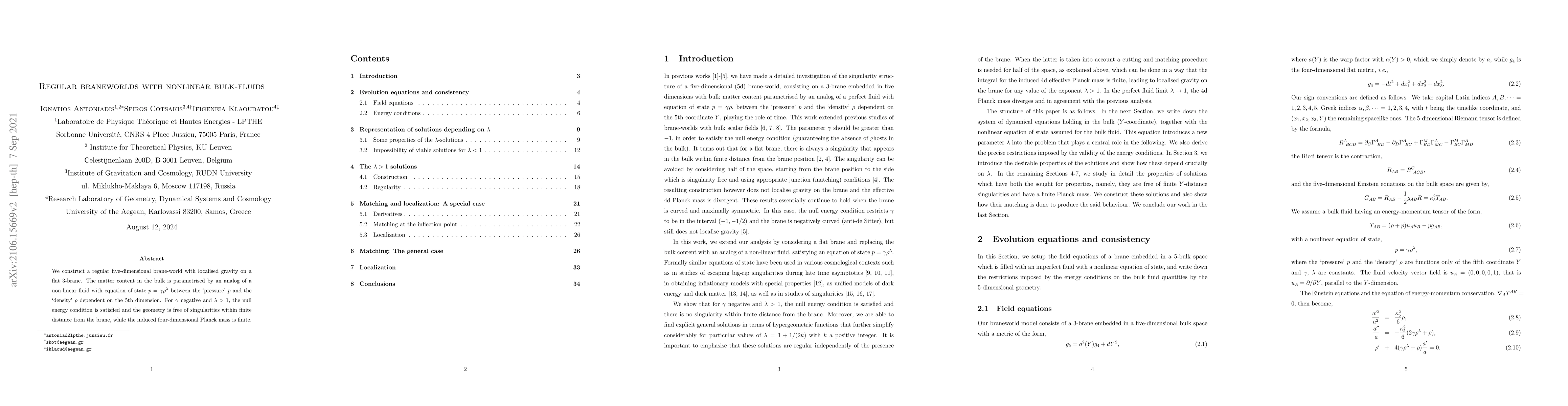 We construct a regular five-dimensional brane-world with localised gravity on a flat 3-brane. The matter content in the bulk is parametrised by an analog of a non-linear fluid with equation of state $p=\gamma\rho^\lambda$ between the `pressure' $p$ and the `density' $\rho$ dependent on the 5th dimension. For $\gamma$ negative and $\lambda>1$, the null energy condition is satisfied, and the geometry is free of singularities within finite distance from the brane, while the induced four-dimensional Planck mass is finite.