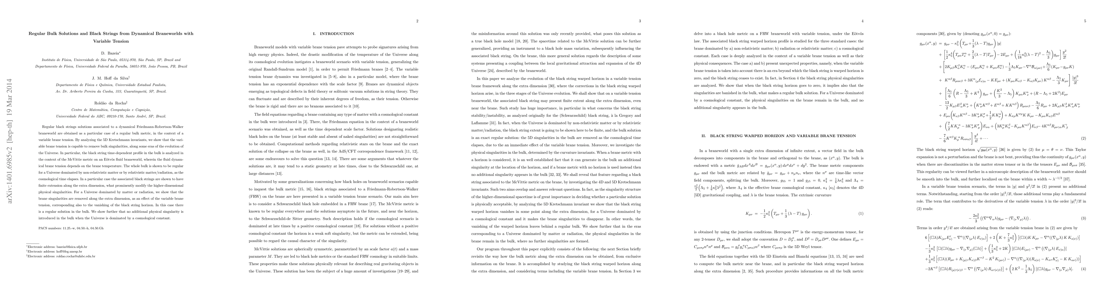 This paper explores regular black string solutions in a dynamical braneworld model with variable brane tension, demonstrating that such tension can eliminate bulk singularities over cosmic time. The analysis reveals that the bulk remains regular under conditions dominated by non-relativistic matter or relativistic matter/radiation, with the variable brane tension effectively removing brane singularities.