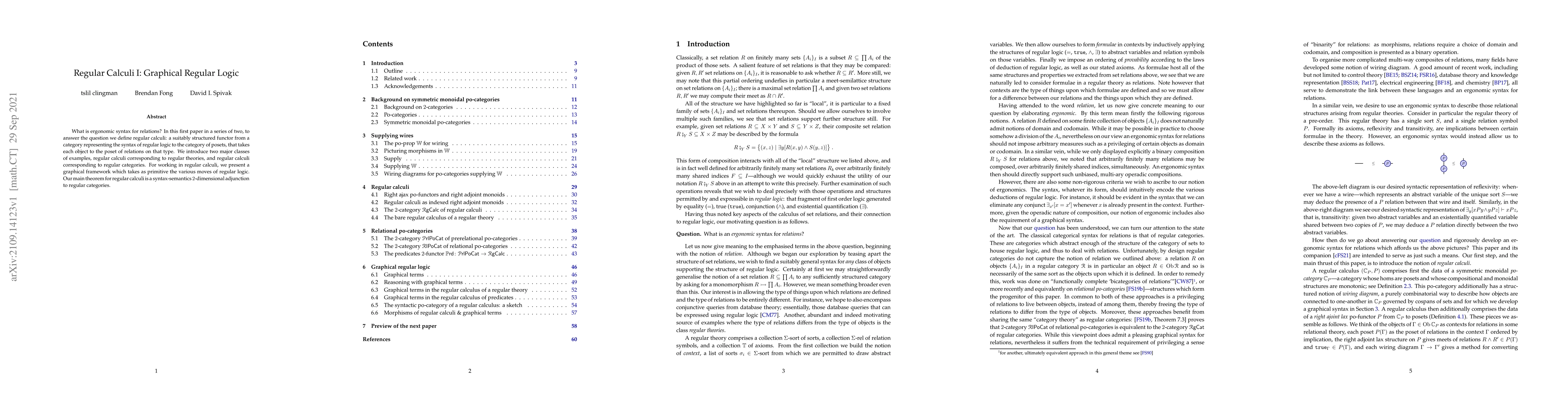 This paper introduces regular calculi, structured functors mapping regular logic syntax to posets of relations, and presents a graphical framework for working with them. It establishes a $2$-dimensional adjunction between regular calculi and regular categories, forming the foundation for ergonomic relation syntax.