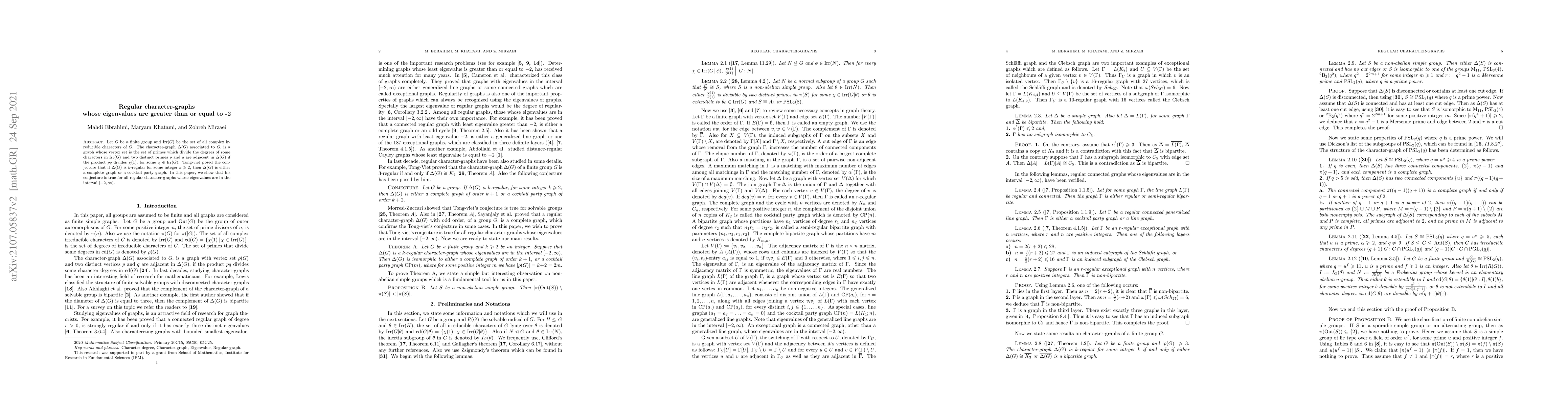 Let $G$ be a finite group and $\mathrm{Irr}(G)$ be the set of all complex irreducible characters of $G$. The character-graph $\Delta(G)$ associated to $G$, is a graph whose vertex set is the set of primes which divide the degrees of some characters in $\mathrm{Irr}(G)$ and two distinct primes $p$ and $q$ are adjacent in $\Delta(G)$ if the product $pq$ divides $\chi(1)$, for some $\chi\in\mathrm{Irr}(G)$. Tong-viet posed the conjecture that if $\Delta(G)$ is $k$-regular for some integer $k\geqslant 2$, then $\Delta(G)$ is either a complete graph or a cocktail party graph. In this paper, we show that his conjecture is true for all regular character-graphs whose eigenvalues are in the interval $[-2, \infty )$.