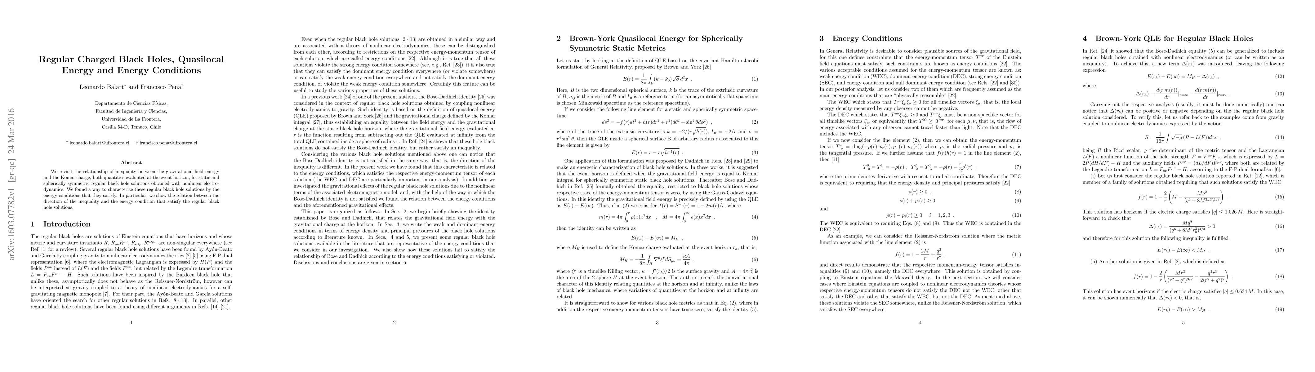 We revisit the relationship of inequality between the gravitational field energy and the Komar charge, both quantities evaluated at the event horizon, for static and spherically symmetric regular black hole solutions obtained with nonlinear electrodynamics. We found a way to characterize these regular black hole solutions by the energy conditions that they satisfy. In particular, we show the relation between the direction of the inequality and the energy condition that satisfy the regular black hole solutions.