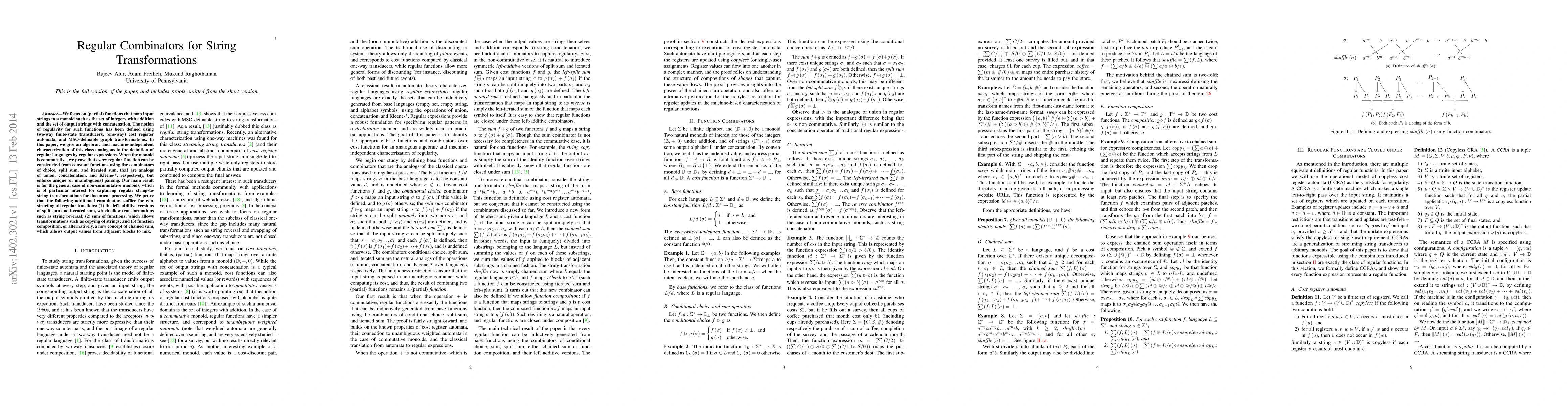 This paper introduces algebraic combinators for constructing regular functions that map input strings to a monoid, analogous to regular expressions for regular languages. For commutative monoids, it identifies specific combinators, while for non-commutative monoids, it proves the necessity of additional combinators for capturing regular string transformations, including string reversal and string copying.