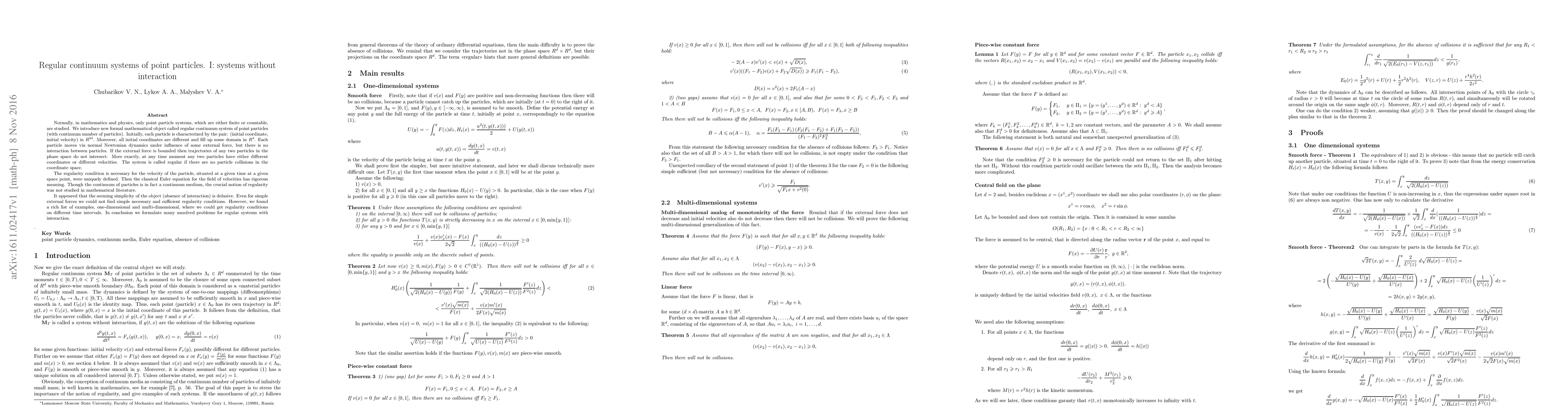 Normally, in mathematics and physics, only point particle systems, which are either finite or countable, are studied. We introduce new formal mathematical object called regular continuum system of point particles (with continuum number of particles). Initially, each particle is characterized by the pair: (initial coordinate, initial velocity) in $R^{2d}$. Moreover, all initial coordinates are different and fill up some domain in $R^{d}$. Each particle moves via normal Newtonian dynamics under influence of some external force, but there is no interaction between particles. If the external force is bounded then trajectories of any two particles in the phase space do not intersect. More exactly, at any time moment any two particles have either different coordinates or different velocities. The system is called regular if there are no particle collisions in the coordinate space. The regularity condition is necessary for the velocity of the particle, situated at a given time at a given space point, were uniquely defined. Then the classical Euler equation for the field of velocities has rigorous meaning. Though the continuum of particles is in fact a continuum medium, the crucial notion of regularity was not studied in mathematical literature. It appeared that the seeming simplicity of the object (absence of interaction) is delusive. Even for simple external forces we could not find simple necessary and sufficient regularity conditions. However, we found a rich list of examples, one-dimensional and mufti-dimensional, where we could get regularity conditions on different time intervals. In conclusion we formulate many unsolved problems for regular systems with interaction.
