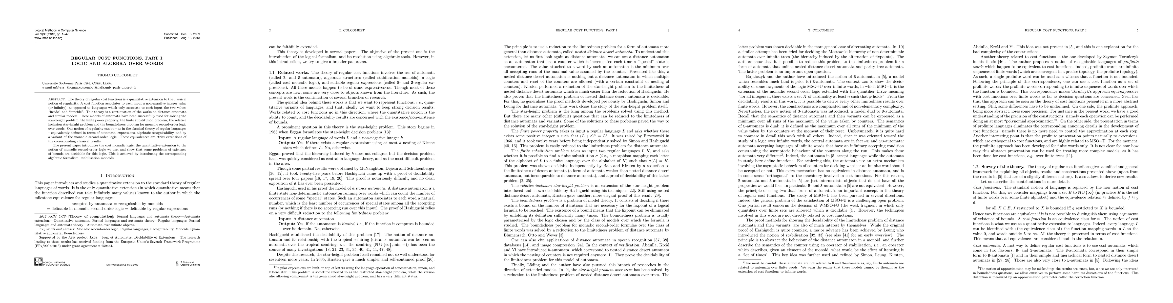 The paper presents the theory of regular cost functions, stabilisation monoids, and cost monadic logic, extending classical regularity theory to quantitative settings.