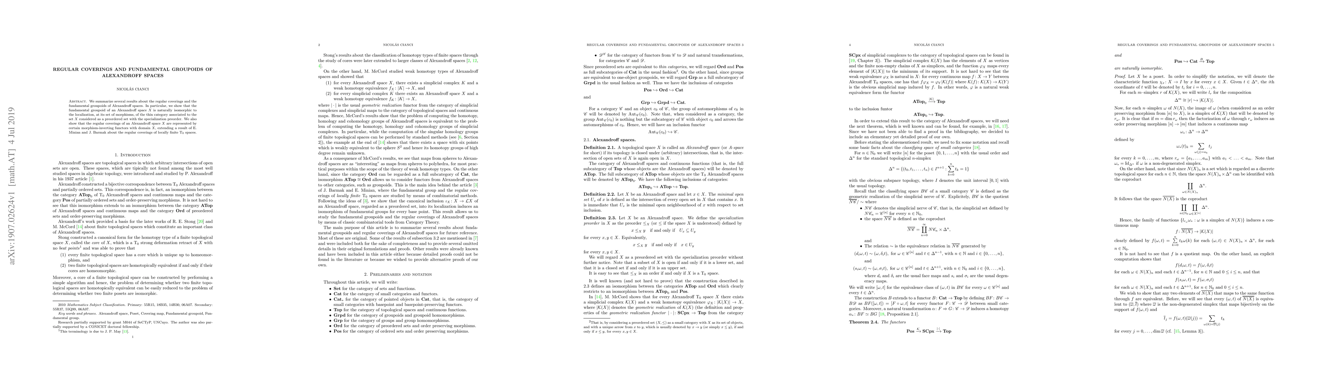Summary: The paper discusses the fundamental groupoids and regular coverings of Alexandroff spaces, proving that their fundamental groupoids are isomorphic to the localization of thin categories derived from preordered sets and extending previous results on locally finite T$_0$ spaces' coverings.