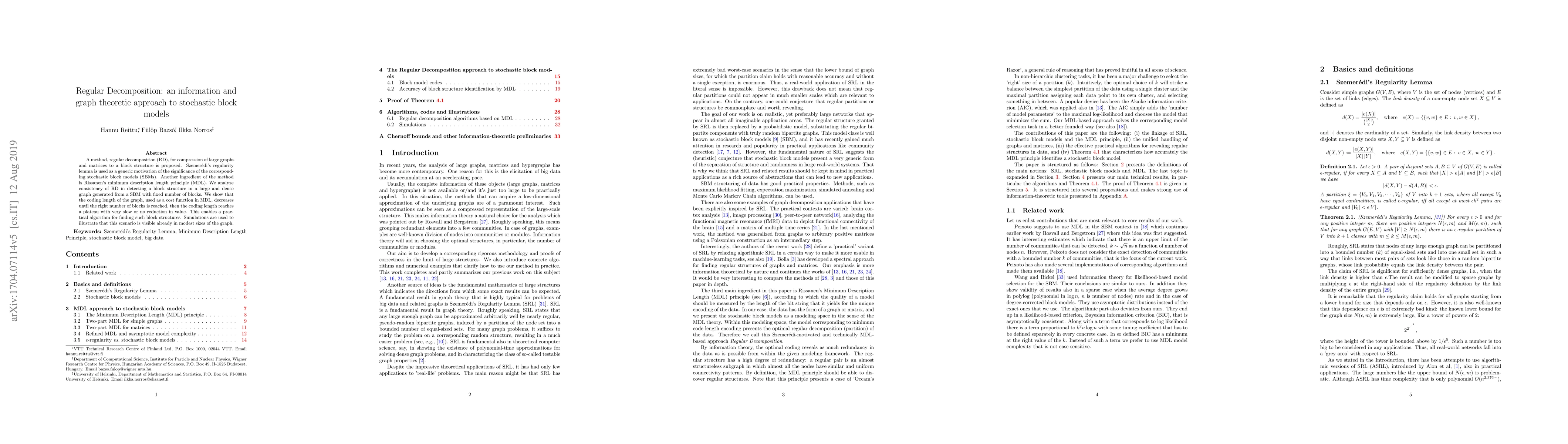 Researchers propose a method to compress large graphs and matrices into a block structure using Szemeredi's regularity lemma and Rissanen's MDL principle, providing practical algorithms and theoretical results on accuracy.