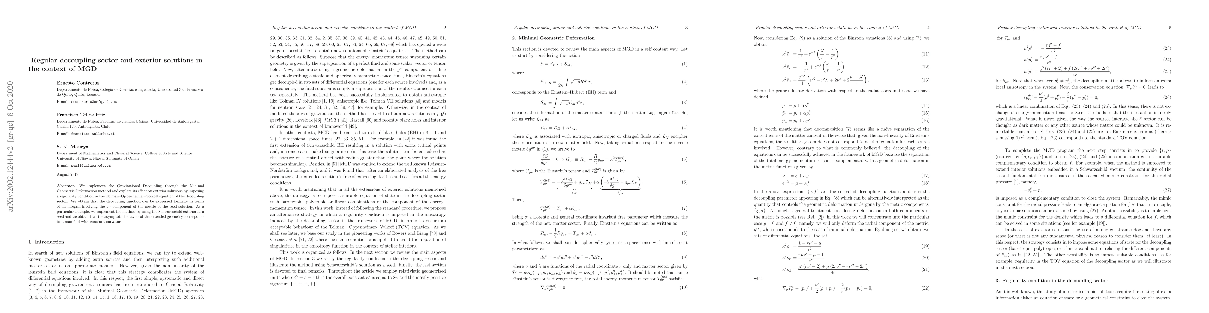 We implement the Gravitational Decoupling through the Minimal Geometric Deformation method and explore its effect on exterior solutions by imposing a regularity condition in the Tolman--Oppenheimer--Volkoff equation of the decoupling sector. We obtain that the decoupling function can be expressed formally in terms of an integral involving the $g_{tt}$ component of the metric of the seed solution. As a particular example, we implement the method by using the Schwarzschild exterior as a seed and we obtain that the asymptotic behavior of the extended geometry corresponds to a manifold with constant curvature.