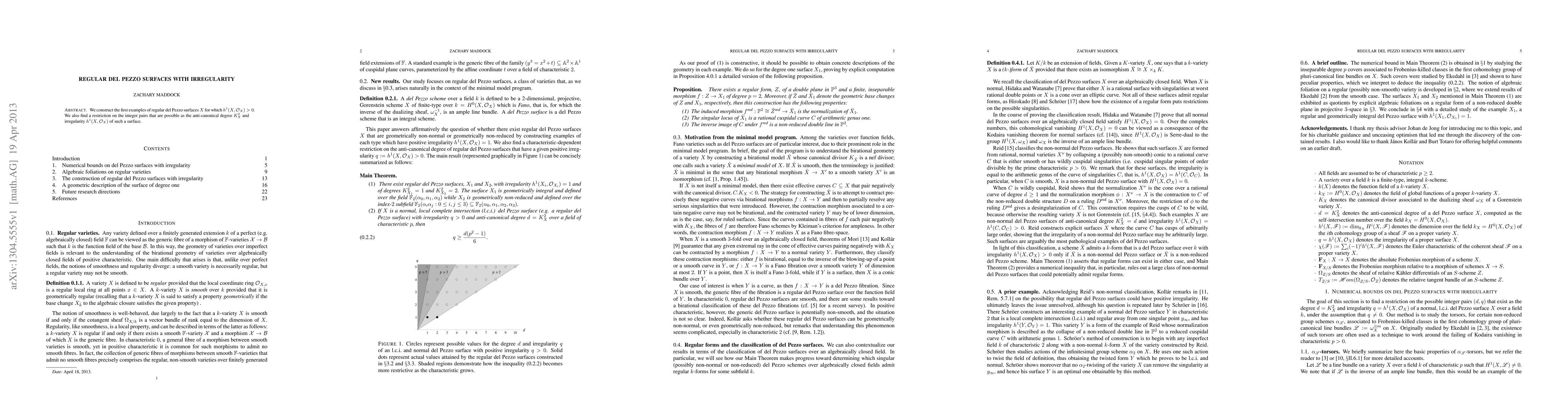 Summary: This paper presents the first instances of regular del Pezzo surfaces with nonzero irregularity, providing constraints on pairs of anti-canonical degree and irregularity for such surfaces.