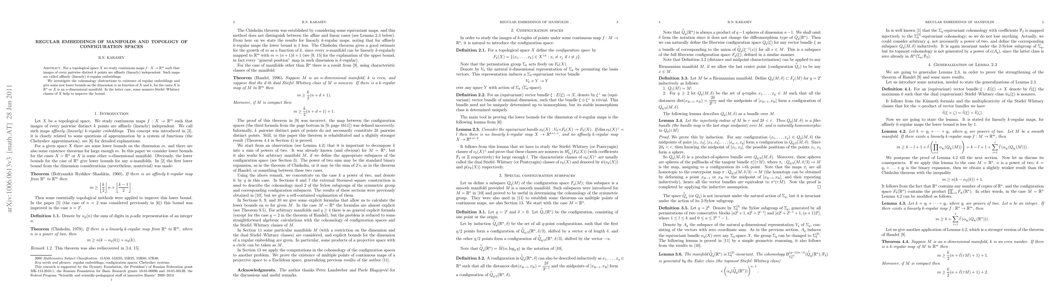 For a topological space $X$ we study continuous maps $f : X\to \mathbb R^m$ such that images of every pairwise distinct $k$ points are affinely (linearly) independent. Such maps are called affinely (linearly) $k$-regular embeddings. We investigate the cohomology obstructions to existence of regular embeddings and give some new lower bounds on the dimension $m$ as function of $X$ and $k$, for the cases $X$ is $\mathbb R^n$ or $X$ is an $n$-dimensional manifold. In the latter case, some nonzero Stiefel--Whitney classes of $X$ help to improve the bound.