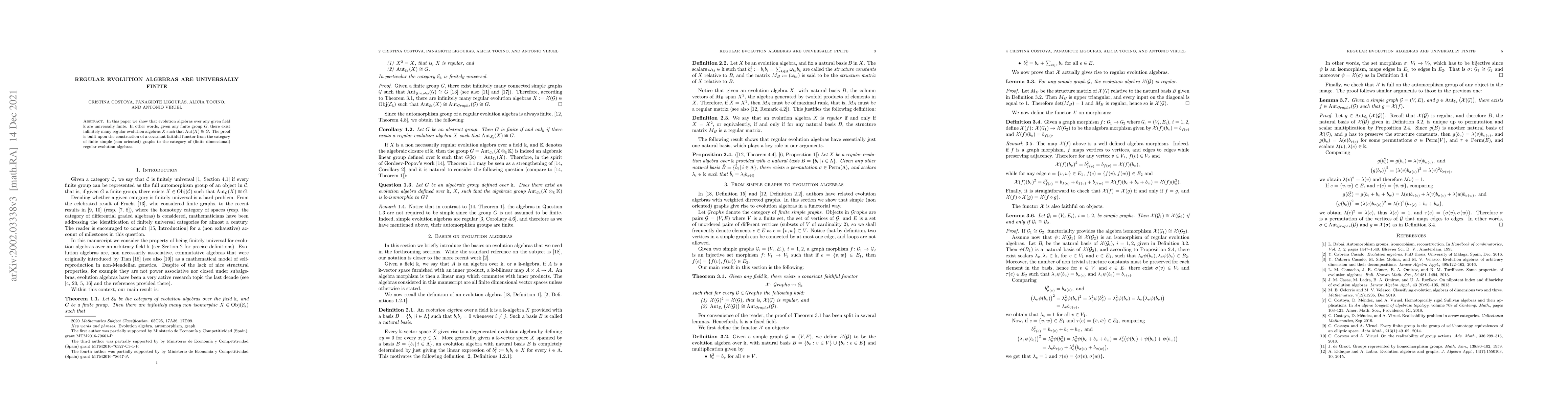 This paper demonstrates that evolution algebras over any field $\Bbbk$ are universally finite, meaning there are infinitely many regular evolution algebras $X$ for any finite group $G$ where $Aut(X)\cong G$. The proof utilizes a covariant faithful functor linking finite simple graphs to regular evolution algebras, and it concludes by showing that any constant finite algebraic affine group scheme $\mathbf{G}$ over $\Bbbk$ is isomorphic to the automorphisms of a regular evolution algebra.