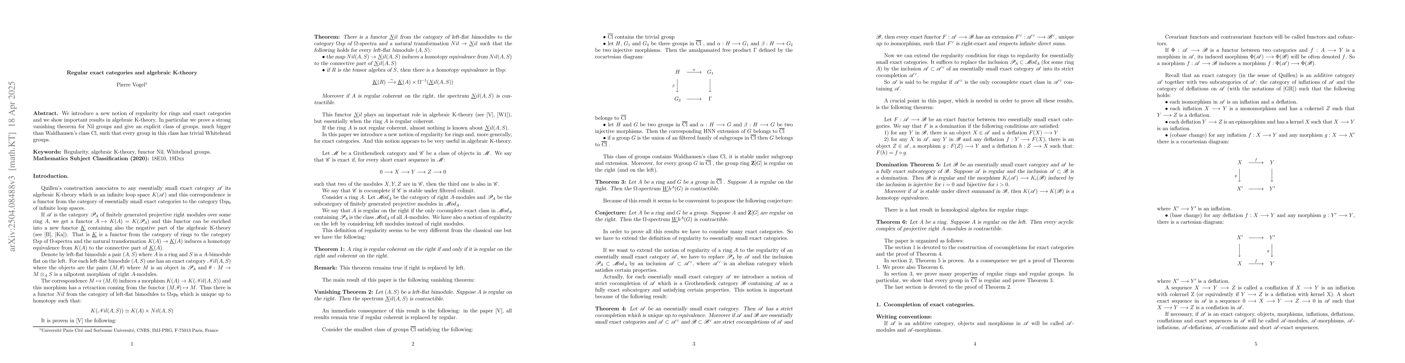 The paper introduces a new notion of regularity for rings and exact categories, employing advanced techniques in algebraic K-theory.