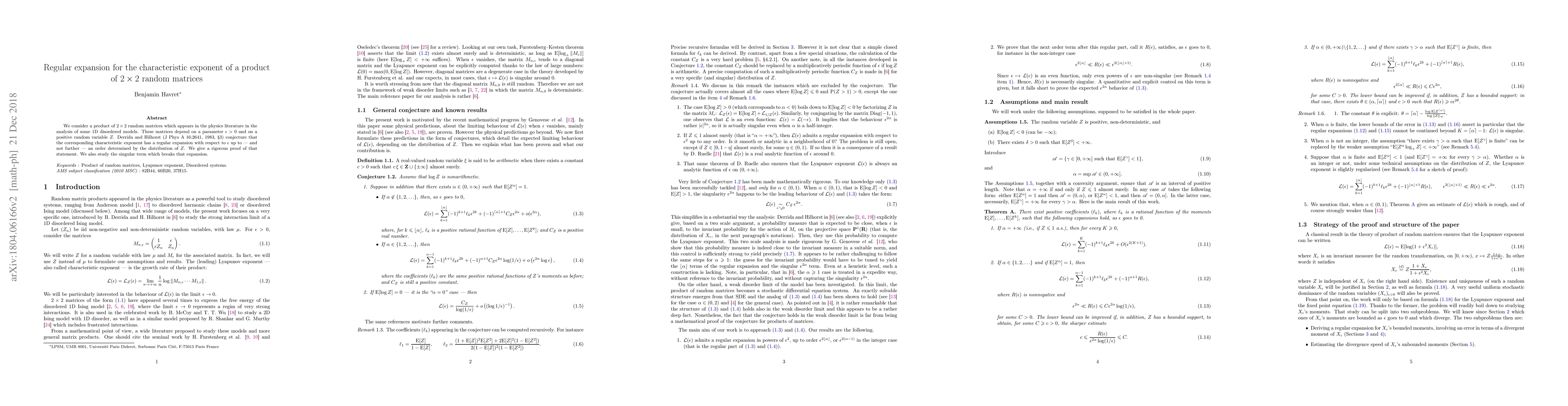 We consider a product of $2 \times 2$ random matrices which appears in the physics literature in the analysis of some 1D disordered models. These matrices depend on a parameter $\epsilon >0$ and on a positive random variable $Z$. Derrida and Hilhorst (J Phys A 16:2641, 1983, \S 3) predict that the corresponding characteristic exponent has a regular expansion with respect to $\epsilon$ up to --- and not further --- an order determined by the distribution of $Z$. We give a rigorous proof of that statement. We also study the singular term which breaks that expansion.