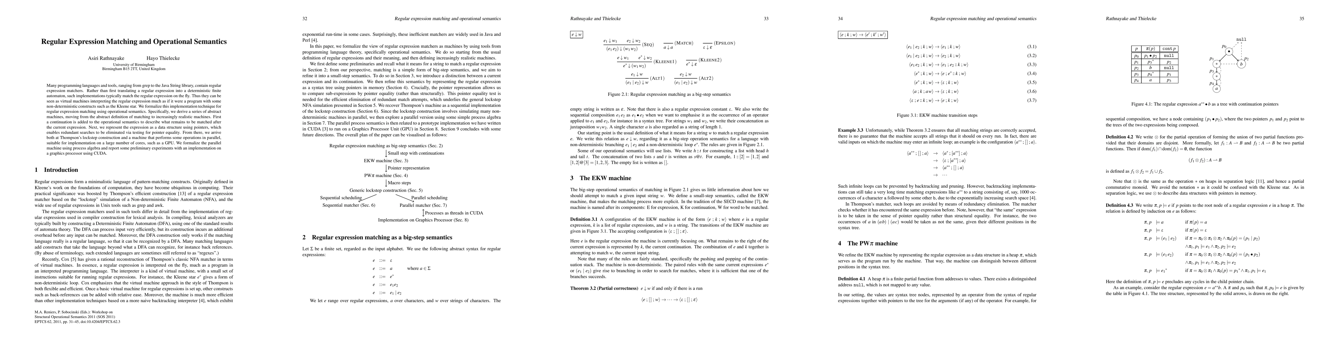 The paper formalizes the on-the-fly implementation technique for regular expression matching using operational semantics, deriving a series of abstract machines from a basic definition to more realistic models, including parallel processing on GPUs.