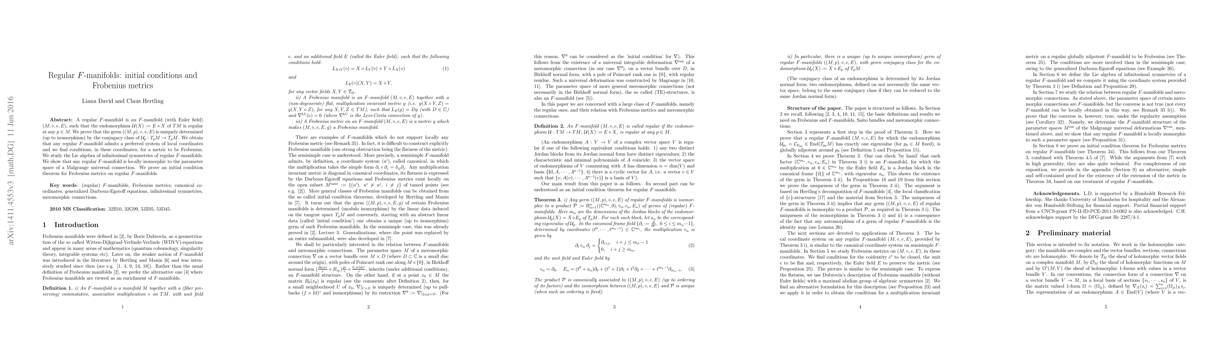 A regular F-manifold is an F-manifold (with Euler field) (M, \circ, e, E), such that the endomorphism {\mathcal U}(X) := E \circ X of TM is regular at any p\in M. We prove that the germ ((M,p), \circ, e, E) is uniquely determined (up to isomorphism) by the conjugacy class of {\mathcal U}_{p} : T_{p}M \rightarrow T_{p}M. We obtain that any regular F-manifold admits a preferred system of local coordinates and we find conditions, in these coordinates, for a metric to be Frobenius. We study the Lie algebra of infinitesimal symmetries of regular F-manifolds. We show that any regular F-manifold is locally isomorphic to the parameter space of a Malgrange universal connection. We prove an initial condition theorem for Frobenius metrics on regular F-manifolds.